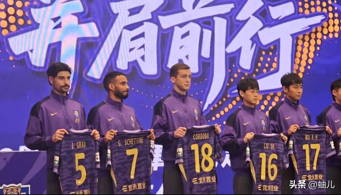 天津津门虎壮行会,新外援球衣号码公布,于根伟谈新赛季思路! 3月1日天津津门虎举行了新赛季壮行大会,会上主帅于根伟向10名新球员颁发了新球衣,中后卫外援格劳是5号球衣,前锋谢内蒂是7号球衣,后腰卡尔瓦罗是18号球衣。 于根伟表示最后一周还是要为第一场联赛做好准备工作,今年的内外援引进的思路主要是为了球队技战术和球队发展建设,内援方面引进了一些年轻球员就是为了球队有一个长久持续的发展。 于根伟说今年联赛遇到了没有想到的巨大困难,如果新赛季克服这个困难说明球队就是成熟了。 您觉津门虎能够克服被罚10分这个巨大的困难吗?