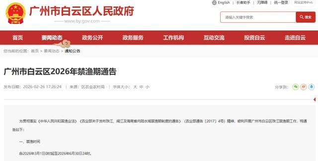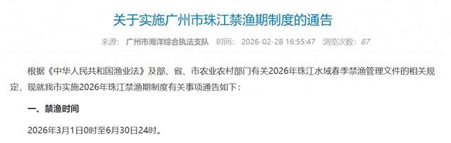2月28日广州市农业农村局官网发布《关于实施广州市珠江禁渔期制度的通告》