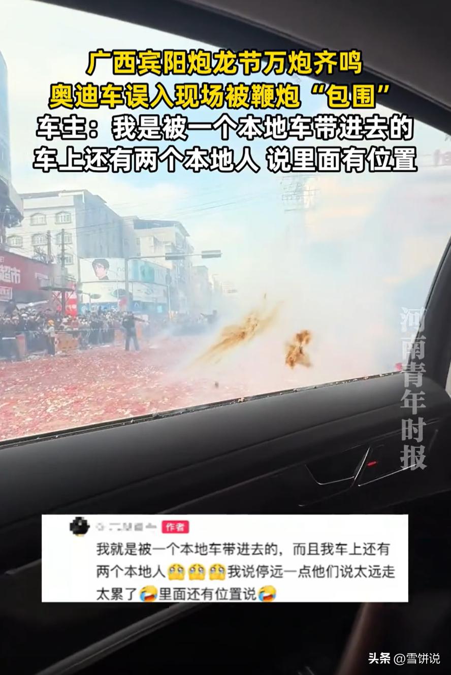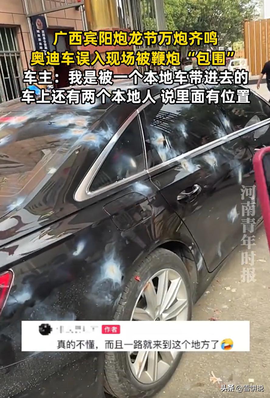 这也太惨了!广西宾阳,男子开着奥迪车去参加炮龙节,没成想,本来是要在外围看热闹的,结果却被一辆本地车给带了进去,直接闯入到放炮的现场,而一些人看到有车闯入,直接把把鞭炮扔过去,也引起了不少争议 当天,男子本来是想要凑个热闹,开着心爱的小奥迪,想去感受一下炮龙节的气氛。本来想着就在外围看看,图个乐呵,结果计划赶不上变化 据他说,路上遇到一辆本地车,也不知怎么的,就把他给带进了通往活动核心区域的路。更要命的是,他车上还坐着两位本地朋友,一个劲儿地说里面有位置,跟着走没错。车主一想,有本地人带路,那还能有假?于是就一脚油门跟了进去 这一跟不要紧,直接把自己送进了鞭炮的汪洋大海。等他反应过来,已经身处炮龙节的激烈战场。满街都是飞舞的炮龙,震耳欲聋的鞭炮声,以及兴奋的人群 路上虽然偶尔有人骑车经过,但是开车的就只有他一辆,有些人可能觉得他是故意的,就直接把鞭炮扔过去,一圈出来后,黑色的车漆被炸成了“斑点狗”,目前他已经交了保险处理 这件事在网上传开后,大家也是议论纷纷,观点几乎分成两派 一派人觉得,车主实在冤枉。人家是外地来的游客,可能真的不熟悉路况,又不是故意要开进去捣乱。如果是误入,完全可以把他拦下来,或者大声提醒一下,让他赶紧开走。直接二话不说就往人家车上扔鞭炮,这确实有点过了,显得不太友好 另一派人则认为,炮龙节是当地的传统活动,肯定有明确的警示牌或者管控区域。车主作为一个成年人,开车进去之前难道不观察一下周围环境吗?再说了,扔鞭炮是活动的核心环节,并不是针对他个人 说实话,这事掰扯起来,两边都有道理。车主确实有观察不周、过于依赖他人意见的疏忽。但另一方面,当看到有车辆误入时,活动现场的组织或者参与者,是否也能多一些理解和引导 其实这也是个提醒,在参加各类活动前,最好先做点功课,了解一下活动的流程、范围和一些不成文的规矩。有时候,网上查到的信息,或者朋友随口的一句话,都比不上自己亲自观察和判断来得稳妥 奥迪车误入炮龙节现场被鞭炮包围