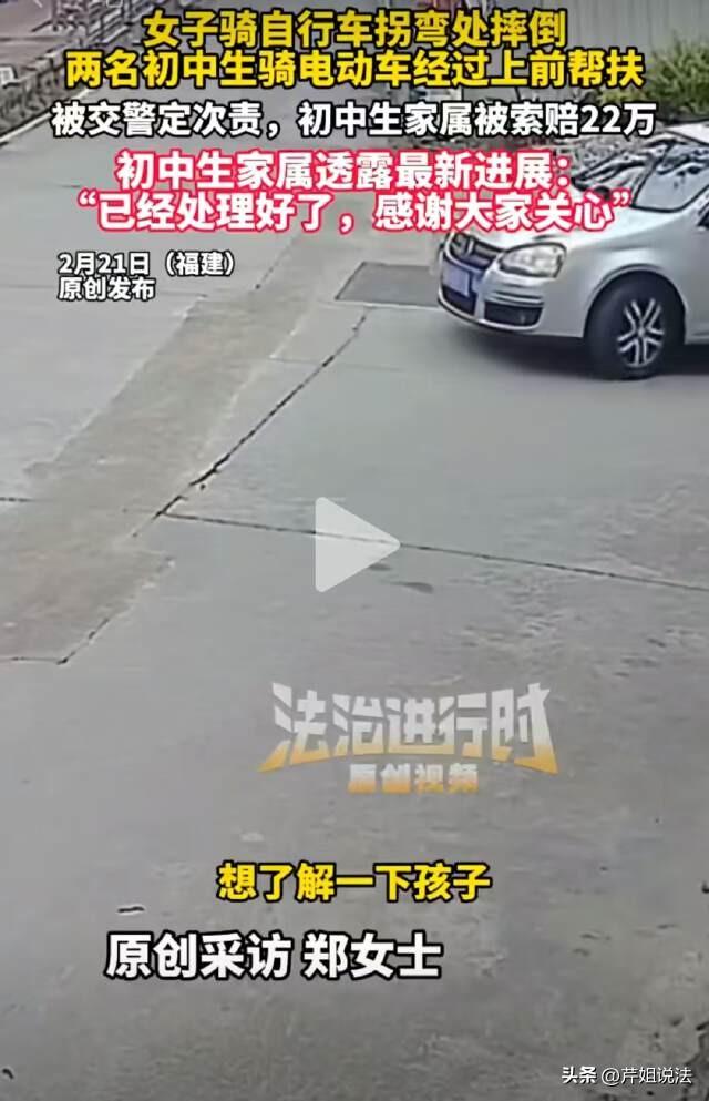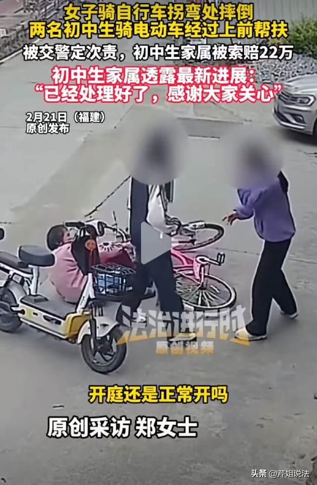 福建莆田,一老人骑自行车拐弯时摔倒,两名骑电动车的初中生看见后停车上前搀扶。结果,这一扶,付出了22万元的天价索赔!老人声称自己是“被吓倒的”;交警认定这是一起“无接触事故”,两名女生承担次要责任;女孩家属鸣冤叫屈,认为“碰都没有碰到他,我们好心去扶,凭什么赔22万元? 福建莆田的一位老人骑着自行车,来到一个乡村十字路口。监控视频完整记录下了整个过程。 老人骑到路口时,一辆白色小轿车从左后方驶来并左转。老人为了避让这辆车,车身向右倾斜了,但很快恢复了正常,继续向前骑行。 看起来,这场小惊吓已经过去了。 可就在这时,两名初中生合骑一辆电动车从侧向路口驶出,她们也准备左转。 就在她们出现在路口的一瞬间,已经恢复骑行的老人突然再次向左避让,紧接着车头剧烈晃动,连人带车摔倒在地。 两名女生看见老人摔倒,短暂犹豫了一下。 监控里能听到,其中一位女生说“那就扶呗,又没事”,两人便停好车,跑上前去,先扶起自行车,再把老人搀扶起来。 这本该是一个充满正能量的故事——两个未成年人,看见老人摔倒,没有选择漠视,而是主动伸手相助。 可接下来发生的事,让两个女孩彻底懵了。 老人被送医后,家属找上门来,说老人是被她们的电动车“吓倒”的,要求赔偿。 更让女孩家长震惊的是,交警出具的事故认定书显示:这是一起“无接触事故”,老人负主要责任,两名女生承担次要责任。 2026年2月,老人家属一纸诉状将其中一名女生及其监护人告上法庭,索赔金额——22万余元。 随后,“初中生扶老人被索赔22万双方和解”的话题迅速登上热搜。 这里不禁有人疑问了,明明两名女生并没有接触老人,为什么还会被判定次要责任呢?22的赔偿又是从何而来? 其实“法律意义上的交通事故,核心是“过错或意外造成损害”,判断的关键在行为与后果的因果关系,而非是否接触。” 生活中常见的“无接触责任”还包括:司机违规变道致旁车躲避撞护栏、货车滥用远光灯致行人摔倒、突然开车门影响非机动车避让等等。判断核心,是一方是否制造了险情。 也就是说,根据已曝光的监控视频来看。 事发位置是一个路口,涉事老太沿道路右侧正常骑行时,先有一辆白色小汽车从右侧路口左转出来,老太为避让白车,向更右侧建筑方向贴近。 此时,两名涉事女生也从该路口左转出现,老太明显作出了一个向左侧避让的动作,车头开始晃动,随即摔倒在地。 之后两名女生停车上前将其扶起。 交警部门很可能据此认为两名女生骑电动车从路口左拐,未主动避让直行的骑车老太,导致其受惊或避让不及而摔倒,故需要承担一定责任。 加上,两名女生尚未满16周岁,不符合骑电动车上路的法定年龄,且存在骑车带人情况,更加重了判定次要责任的依据。 那么,高达22万元的赔偿金又是怎么计算出来的呢? 据悉,老人的实际医疗费仅2.67万元,索赔却高达22万多,是实际医疗费的10倍以上。 根据已经曝光的信息显示:老人的起诉书上密密麻麻列着医疗费、护理费、营养费、伤残补偿、精神损害抚慰金等各项费用,共计索赔金额—224307.73元。 据专业法律分析人士认为,22万的赔偿金明显过高。 纵使老人的摔倒确实与女孩的骑行行为存在一定关联,但女孩又没有明显过错,可以依据《民法典》第1186条规定:受害人和行为人对损害的发生都没有过错的,依照法律的规定由双方分担损失。 即判令女孩一方分担部分损失。但这种分担是“补偿”而非“赔偿”,金额通常不会太高,更不可能达到22万。 况且监控显示,老人第一次避让的是一辆白色轿车。但在这起事故的责任认定和后续索赔中,白色轿车及其驾驶员始终“隐身”,没有出现在事故认定书内,也没有成为索赔对象。 如果白色轿车在转弯时未按规定让行或未尽到观察义务,它也应该承担相应责任。将全部焦点集中在两名女孩身上,显然不够公平。 目前虽然原告已经撤诉,但这场风波留给我们的思考,不该就此翻篇。 随着“该不该扶”的话题再一次上榜热搜,尊老爱幼的善举和法律法规的责任界定之间该如何正确裁定划分,成为一道全社会必须回答的问题。 对此,您怎么看?欢迎留言交流。 作品声明:内容来源于法治进行时