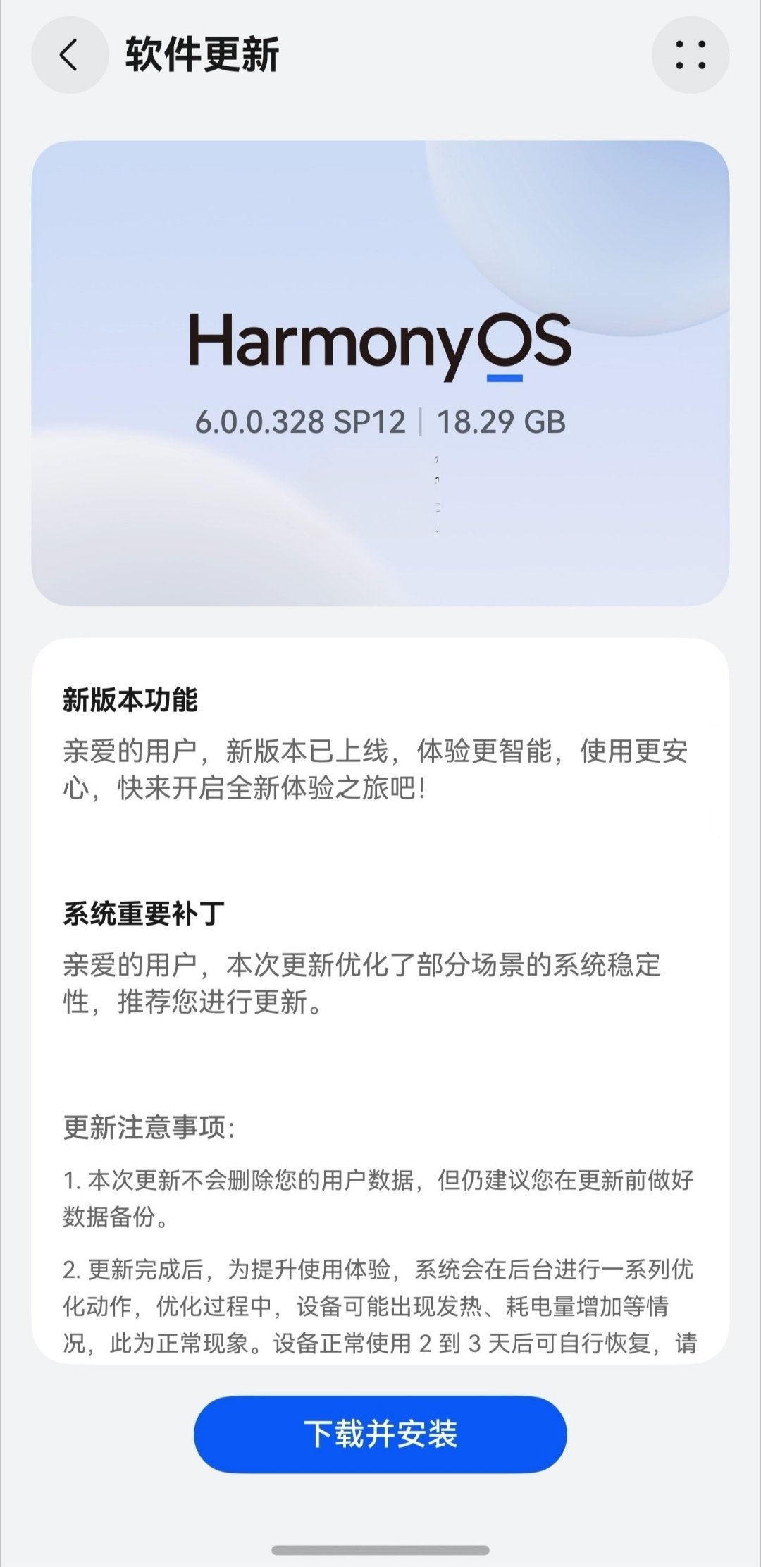 目前“328”新版本已开启推送,更新包大小超 10GB(部分机型更新包超 18GB),属于大版本范畴,或为鸿蒙 HarmonyOS 6.1 的前瞻。