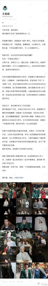 王星越长文告别萧怀瑾 王星越用一篇真诚的长文和萧怀瑾说再见。感谢你诠释了这样一个有血有肉的角色,陪伴我们度过寒假。期待下次重逢,期待新的故事!