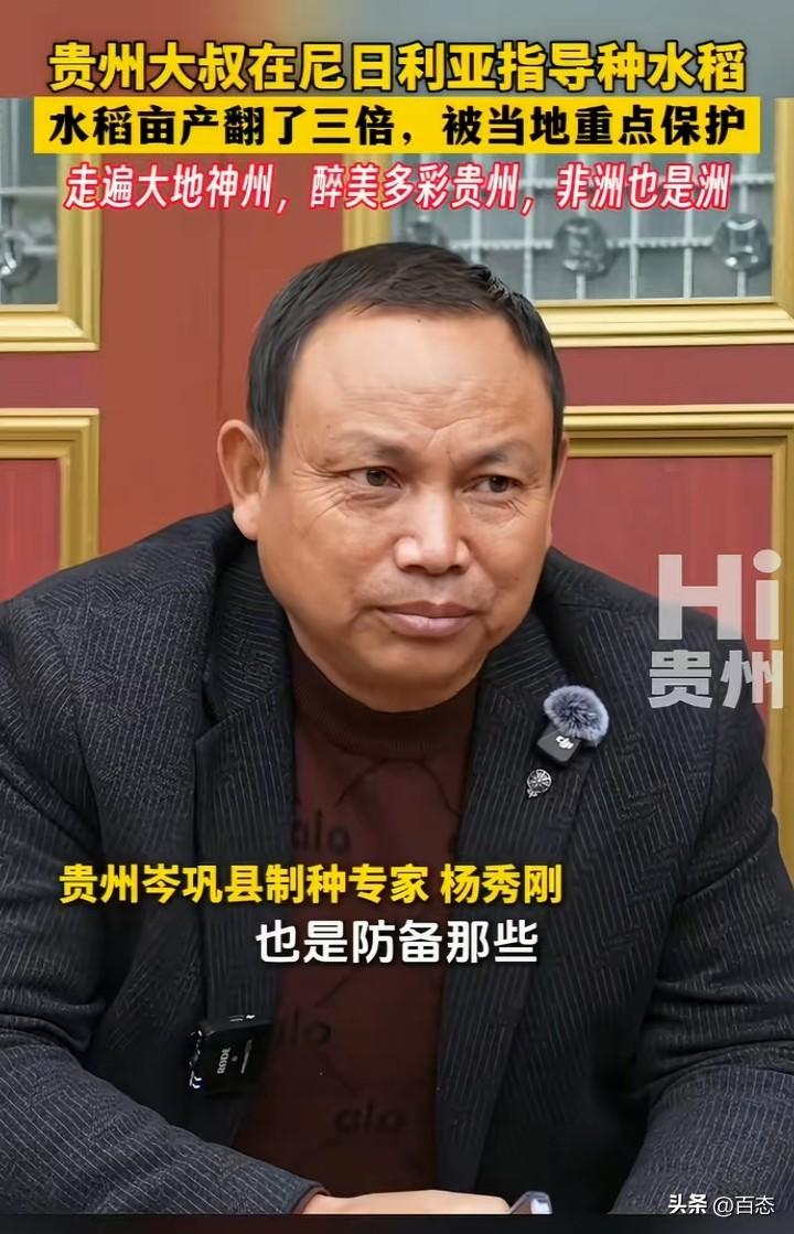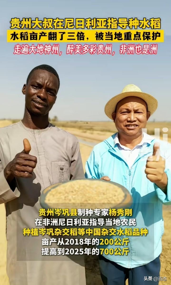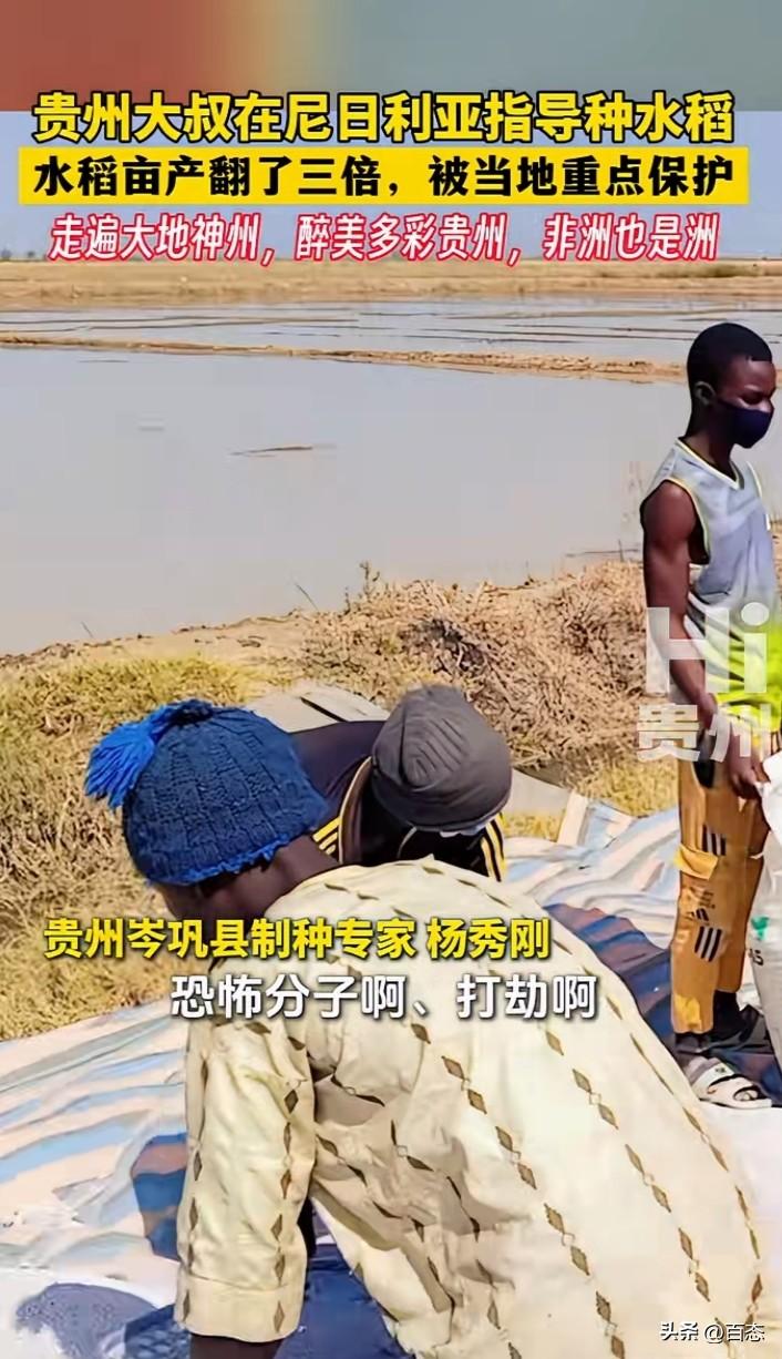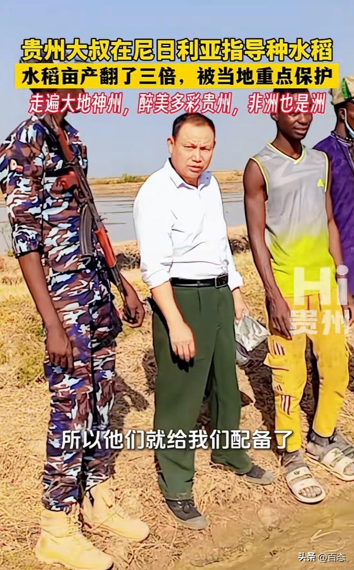 贵州大叔在尼日利亚指导种植水稻,当地的水稻亩产翻了三倍,种植中国的杂交水稻从200斤提高到了700斤。原来贵州这位大叔是一位种植专家,由于当地的治安不好,被当地重点保护,配有保镖。 中国杂交水稻为世界做出了巨大的贡献,非洲很多人还处于饥饿之中,能种植中国的杂交水稻,解决了一部分人的粮食问题。 中国人在哪里都是受欢迎的,因为能为当地带来财富。希望他们能继续为当地创造财富。 你们怎么看呢?