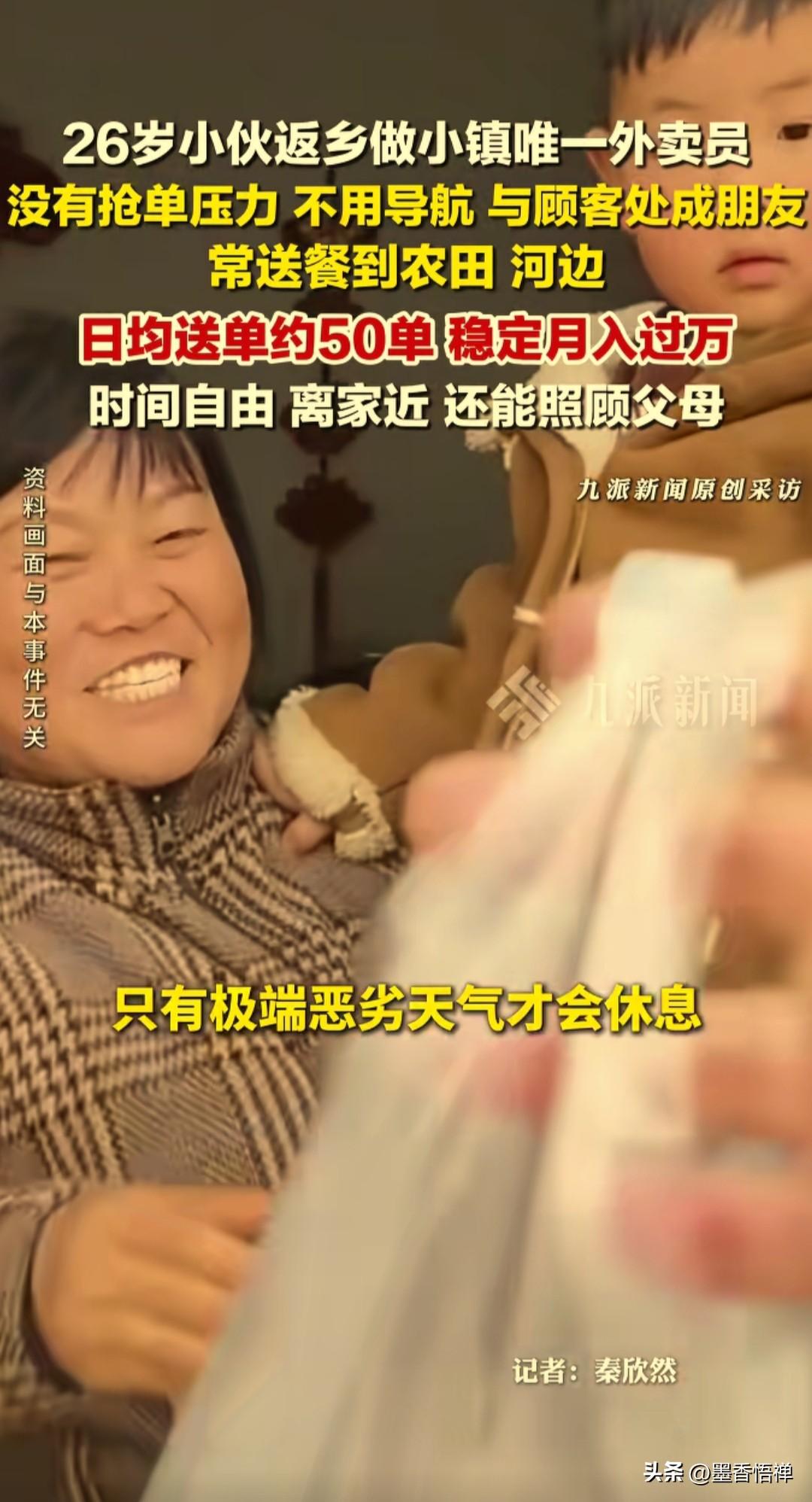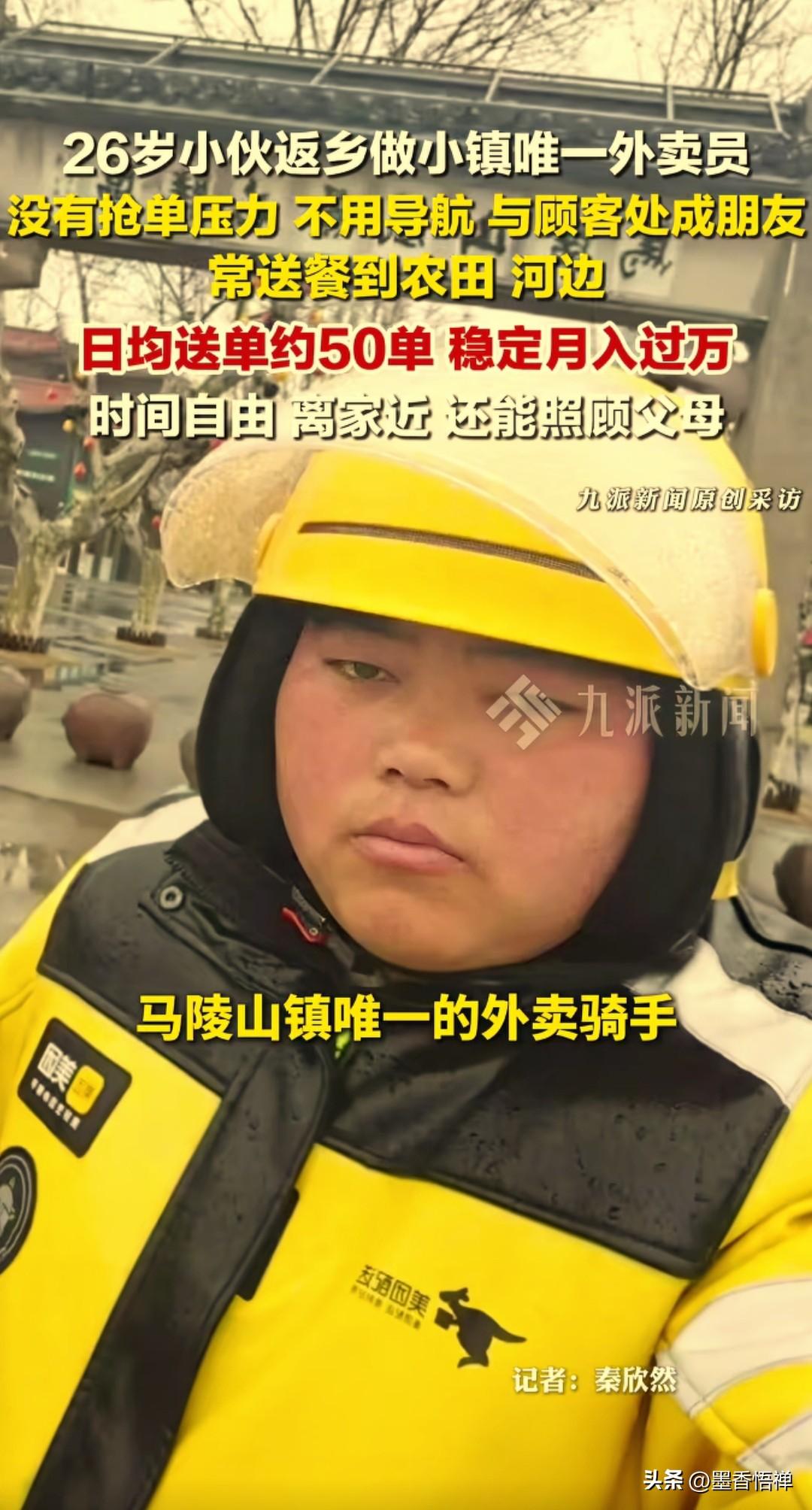 徐州26岁小伙成小镇唯一外卖员,日送50单月入过万,没有抢单压力全是熟人 在江苏徐州马陵山镇,26岁的张瑜成了当地备受关注的人物,他是全镇唯一的外卖骑手,一人撑起整个小镇的外卖配送,日均送出约50单,月收入稳定破万,没有城市骑手的抢单焦虑,时间自由,还能陪伴照顾父母,这份“神仙工作”让网友直呼羡慕。 三年前,他还在城市里打拼,这次回乡之后尝试送外卖这一试,竟让他找到了新的人生方向。他既是乡镇外卖的承包商,负责对接平台、洽谈商家,也是站点站长,统筹管理所有业务,更是镇上唯一的常驻骑手,包揽全镇配送。 马陵山镇西靠马陵山风景区、东临沭河,镇中心夹在中间,张瑜对全镇的每一条小路、每一个村庄都烂熟于心,送餐根本不用导航。 和城市外卖不同,他的配送场景全都充满乡土气息,给农田里劳作的农人送饭、为河边钓鱼的顾客跑腿,还会给行动不便的老人,送去在外子女远程点的热饭。最远的一单,他曾骑着电动车跑了20公里送到邻镇。 三年下来,张瑜和顾客早已超越了雇佣关系,成了熟络的邻里。镇上的商家、顾客大多能叫出他的名字,取餐时会留他喝口水、聊几句家常。 遇到定位不准的订单,他靠打电话沟通、凭记忆找路,哪怕晚到几分钟,熟客们也从不催促。这份人情味,让他的工作少了很多压力。 “镇上行动不便的老人不少,要是我不干了,他们吃饭都成问题。”这份责任感,让张瑜很少给自己放假。 除了遇到极端恶劣天气,他基本每天从早上9点忙到晚上10点,哪怕发烧到39度,也坚持送完最后三单。节假日单量增加,收入还能再涨一截,比在城市打工更踏实。 如今,蜜雪冰城、瑞幸咖啡等连锁品牌陆续入驻马陵山镇,乡镇外卖的需求越来越大。张瑜说,国家支持乡镇经济发展,镇里建设越来越好,他对这份事业充满信心,暂时不考虑转行。 对他而言,这份工作最大的意义,是能陪伴在父母身边。以前在大城市,父母身体不舒服他帮不上忙,现在家就在镇东头,送完外卖回家就能喝上母亲煮的热粥,家里有任何事,他都能第一时间赶到。 张瑜的故事,成了返乡就业的鲜活样本。不必挤破头往大城市卷,在乡镇这片热土上,找准需求、踏实肯干,同样能实现增收,守住乡愁。