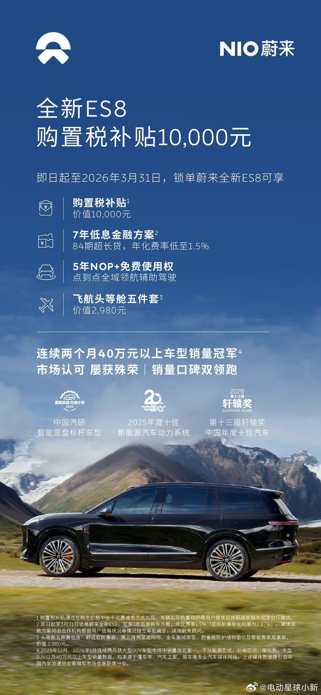 - 蔚来全新 ES8:购置税补贴 10000 元