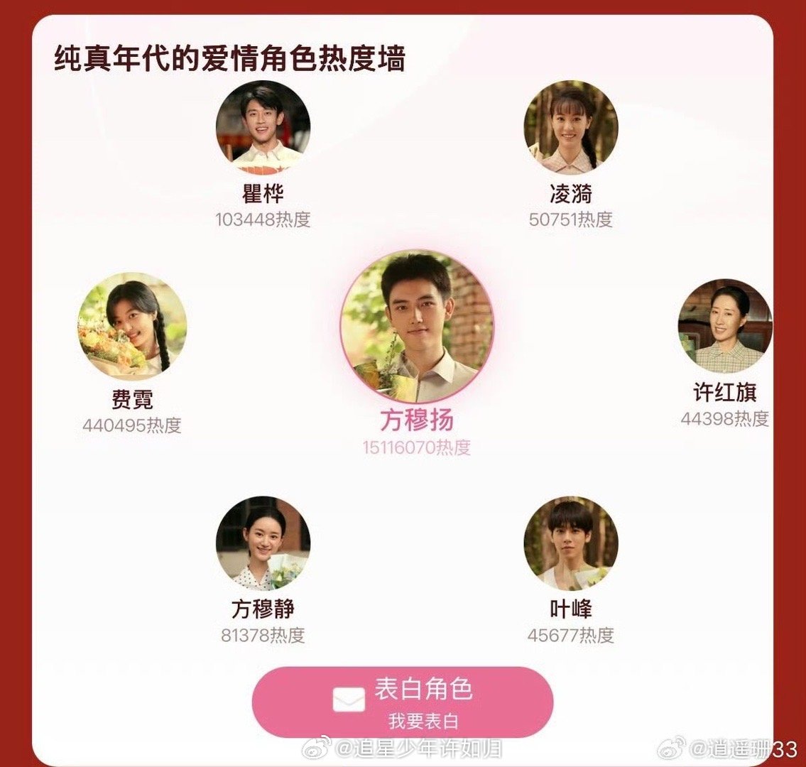 陈飞宇角色热度值破千万 恭喜方穆扬热度破千万!陈飞宇用演技证明了自己,用角色圈粉无数。每一份喜爱都是最好的认可,期待他带来更多好作品!纯真年代的爱情