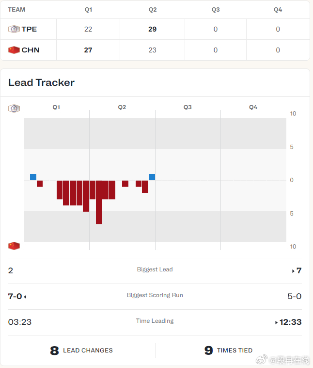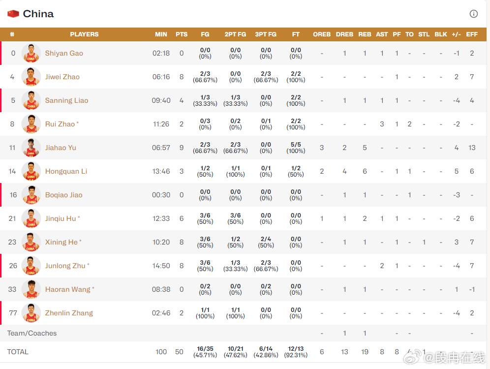 半场50-51落后1分。这段时间的防守不太好……贺希宁在的那段时间很不错,时间可以再拉长一些。第二节最后29秒,焦泊乔登场,中国队完成上半场的12人轮转。焦泊乔在抢下篮板后太急了,出球失误,导致对手命中反超三分中国男篮vs中国台北男篮