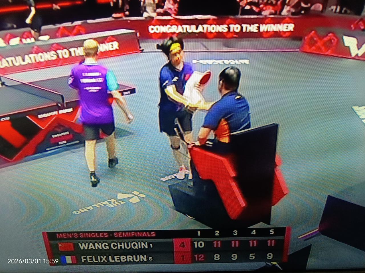 王梦钦4:1击败菲利克斯.勒布伦,顶住如山的压力维护国球荣耀。 在这次新加坡大满贯赛中,中国乒乓球队已先后在混双、男双、女双中丟冠,目前只有女单冠军确保是中国队的,国乒男队又只有王楚钦一个人打进男单四强,如果王楚钦不跨过小勒布伦这一关,不仅国乒男队将创新加坡大满贯最差战绩,就是整个中国队也将创造新加坡大满贯最差战绩。 由此可见,王楚钦的压力有多大。所以尽管王楚钦此前对小勒布伦保持全胜,但是因为紧张王楚钦第一局10平以后还是输了,在第三局小勒布伦连续追分的时候,王皓指导赶紧叫了暂停,让王楚钦调整好呼吸,定下心来去打比赛,重新上场的时候王楚钦才稳定心神,掌控了比赛局势,最后以大比分4:1战胜了小勒布伦,挺进最后的决赛,也为国乒男队保留了夺冠的希望。