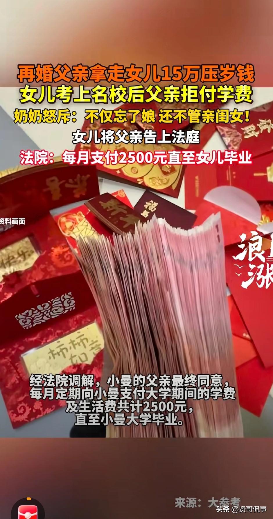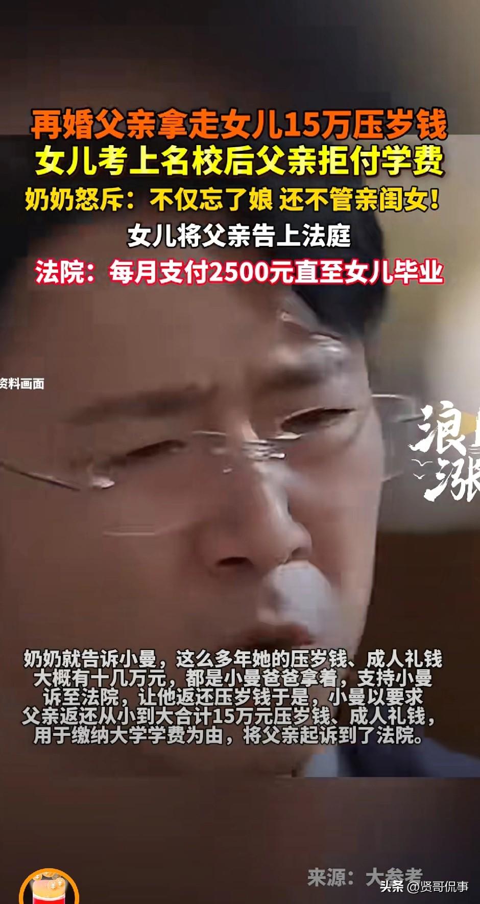 “枉为人父!”江西上饶,12岁女孩在父母离婚后,跟着母亲一起生活,父亲再婚后则对她不闻不问。这还不算完,女孩的父亲还将女孩多年来的15万元压岁钱全部拿走。在女孩考取大学后,由于母亲无力供养,女孩便找到父亲想让他帮忙交学费,父亲竟直接一口拒绝了。无奈之下,女孩只好在奶奶的支持下告上法院,法院这样判了! 18岁的小曼刚拿到大学录取通知书,本该是全家高兴的事,可她和母亲却愁得睡不着觉。 小曼12岁时,父母离婚,从此她便跟着母亲一起生活。 父亲再婚之后,就像彻底消失了一样,多年对小曼没有任何关心,家里的一切都要靠母亲。 母亲一个人打零工苦苦支撑,好不容易把小曼供到高中毕业,小曼也很争气地考上了大学。 可大学的学费和生活费,母亲实在再也扛不动了。 走投无路之下,小曼鼓起勇气去找父亲,希望他能承担一部分学费。 可让她心寒的是,父亲直接拒绝,一句“我没义务”,把亲生女儿直接挡在了门外。 回到家后,小曼和奶奶抱怨起了此事。 奶奶知道后当场怒了,对着小曼的父亲就是一顿怒斥:“你不但忘了娘,连亲闺女都不管了!” 为了让小曼能成功入学,奶奶东拼西凑,先帮小曼交了第一年学费。 可每个月的生活费,成了悬在头顶的难题。 这时奶奶告诉小曼,她从小到大的压岁钱等加起来合计有15万元,全都被她的父亲以“帮忙保管”的名义拿走了,一直没还。 奶奶坚定地支持小曼,让她去法院把这笔钱要回来。 于是,小曼将父亲告上了法院,要求他返还多年来的压岁钱,用于大学开支。 此事一出,网友们纷纷指责小曼的父亲,认为他生而不养,何以为父?即便再婚有了新家庭,也不是抛弃孩子的理由和借口。 “不养女儿还攥着原本属于女儿的压岁钱,实在让人发指!” 那么,从法律上讲,该如何评价此案呢? 1、15万元的压岁钱,法律上属于小曼个人财产。 根据《民法典》规定,长辈给孩子的压岁钱、成人礼红包,属于无偿赠与,所有权归孩子本人。 父亲以“代为保管”为由拿走,如果没有用于小曼的日常必要开支(如学费、生活费),就是非法侵占,小曼当然可以要求父亲予以返还。 2、父亲拒绝支付小曼大学学费,法律上合法,但情理上需担责。 《民法典》规定,父母仅对未成年子女,或无法独立生活的成年子女有法定抚养义务。小曼18岁读大学,显然已不符合“无法独立生活”的法定情形,父亲可拒绝支付学费。 最终,经法院调解,双方达成协议:由小曼的父亲每月支付2500元,直至小曼大学毕业。 父母离婚,受伤害最大的永远是孩子,而作为父亲,组建了新的家庭,竟忘了自己的亲生骨肉,忘了自己作为父亲的责任与义务,这对小曼来说,无疑是更大的伤害。 而奶奶的挺身而出,不仅给了小曼继续求学的机会,更给了她温暖与底气,让她知道,就算没有父亲的疼爱,她也不是孤身一人。 总之,我们无法评判父母对婚姻的选择,但我们始终坚信,生而不养,养而不教,是为人父母最大的失职。 对此,你怎么看呢?欢迎大家在评论区留言。