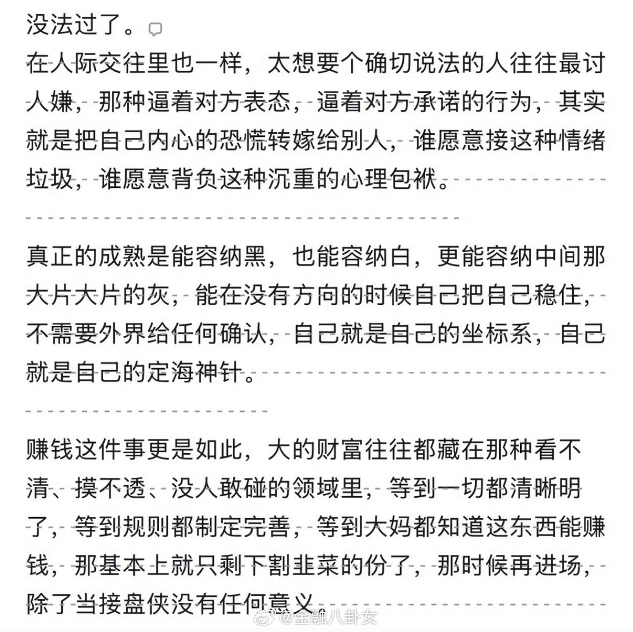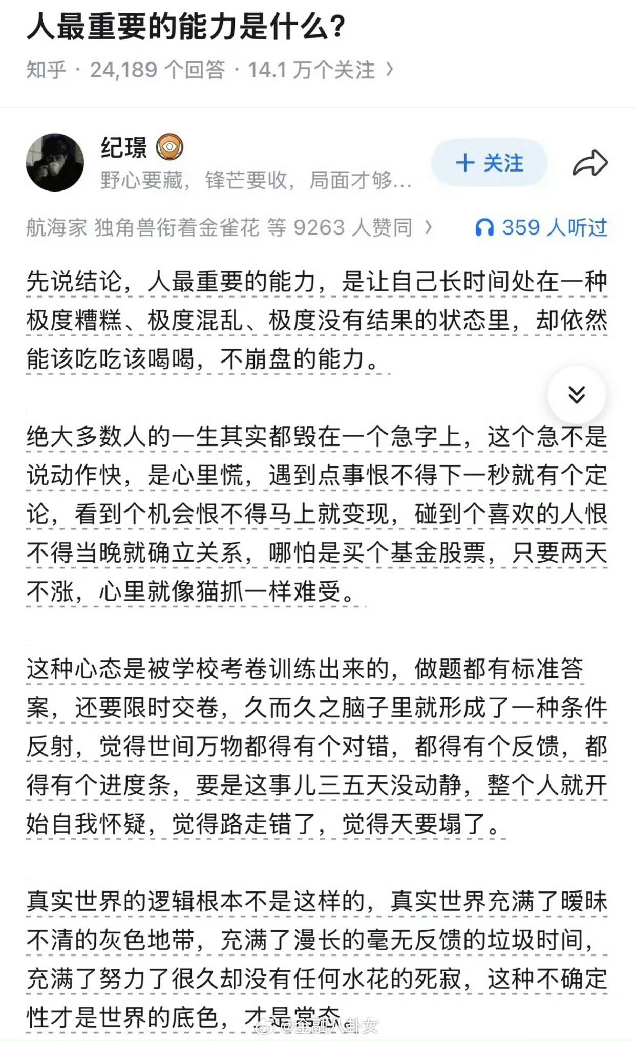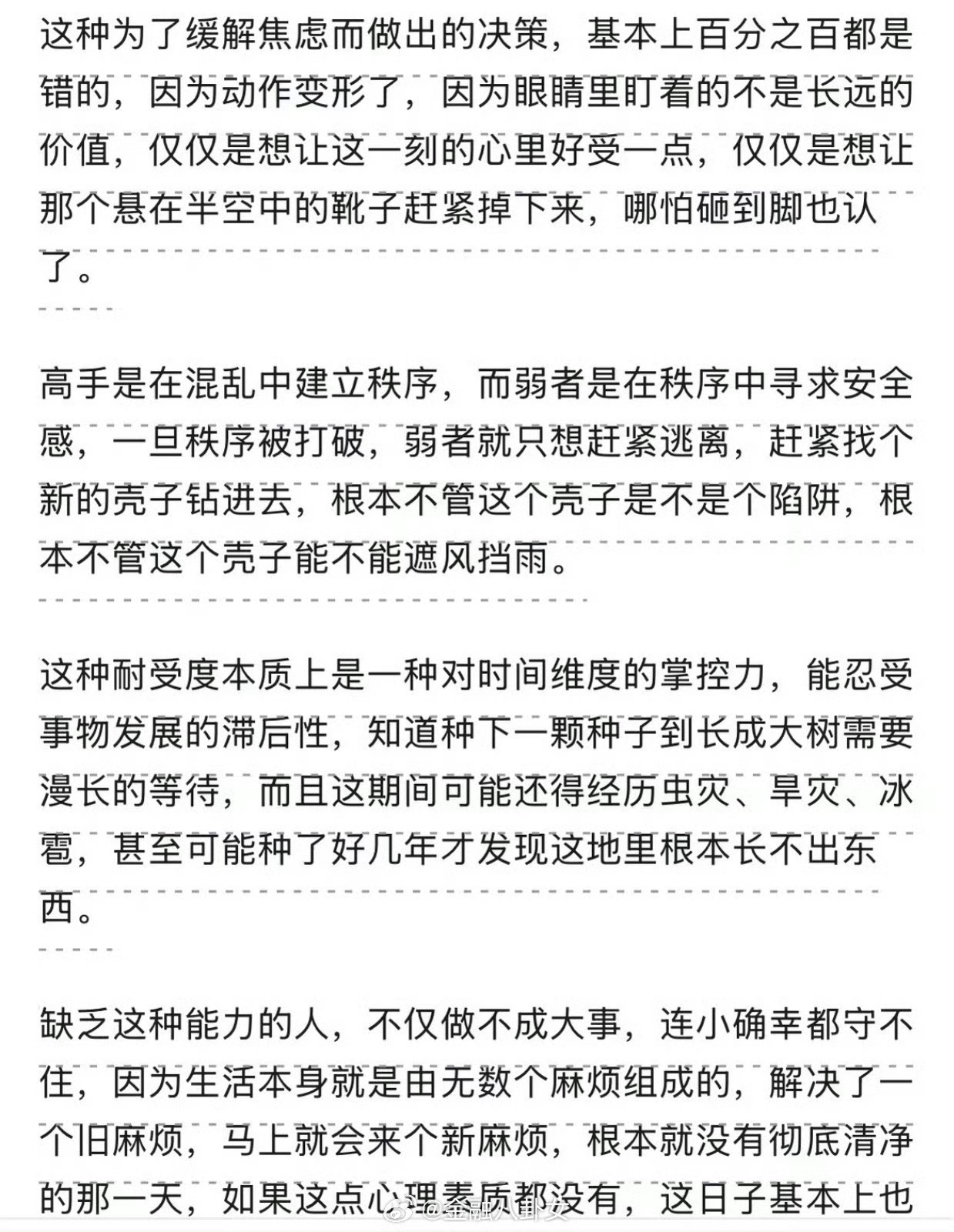人最重要的能力是什么?当自己长时间处在极度糟糕、极度混乱、极度没有结果的状态里,仍旧该吃吃该喝喝,不崩盘的能力!允许事情变坏、允许局面失控、允许自己暂时无能为力,但绝不允许自己心态跟着崩坏!