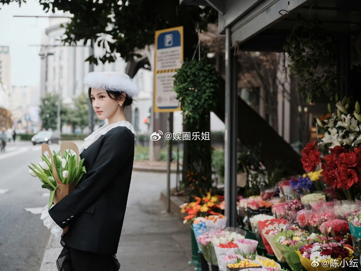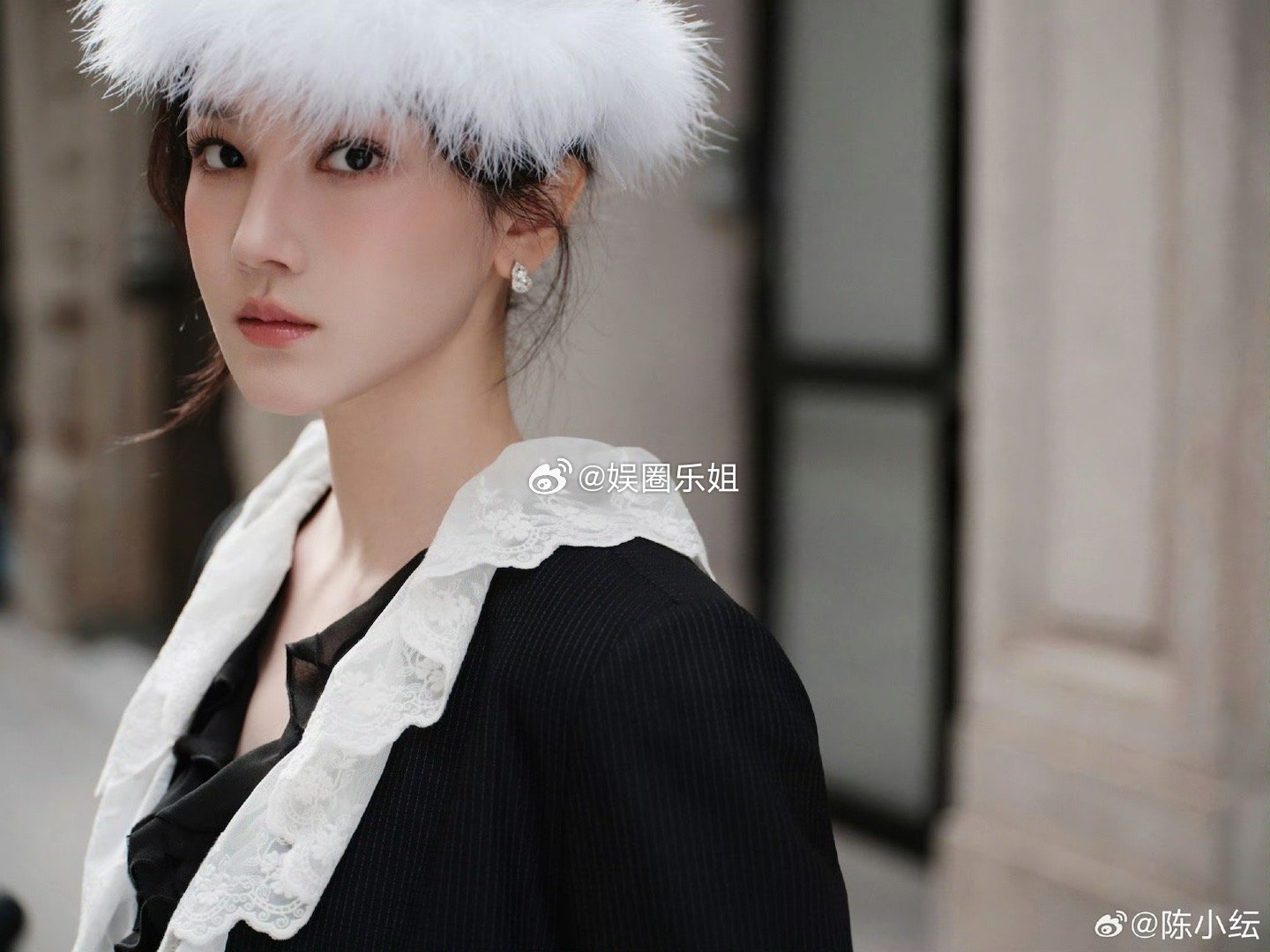 陈小纭米兰首秀|造型美出天际!一袭黑白配色的复古裙装,蕾丝翻领配袖口花边,轻盈黑纱裙摆飘逸灵动,搭配白色羽毛礼帽,法式优雅与现代简约完美融合