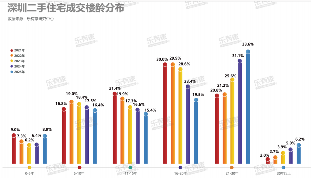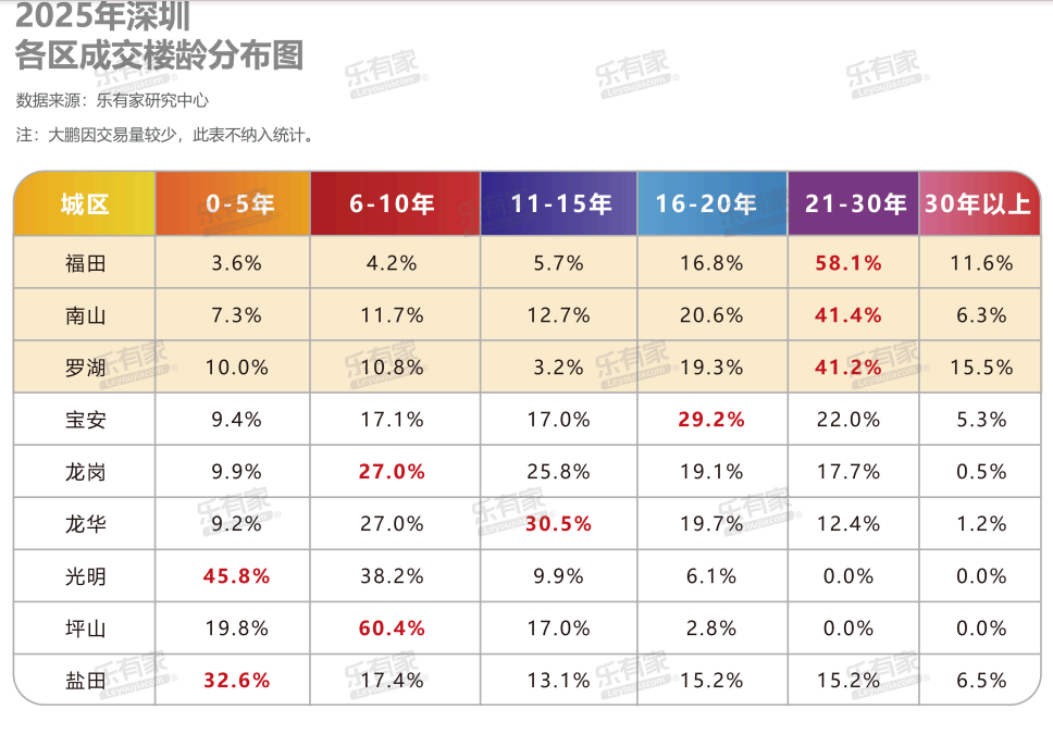 数据显示,楼龄在21-30年的房源,成交占比从2021年的20.8%飙升至33.6%。在福田、南山、罗湖等核心区,15-30年楼龄的房源更是占到了成交的六成以上。