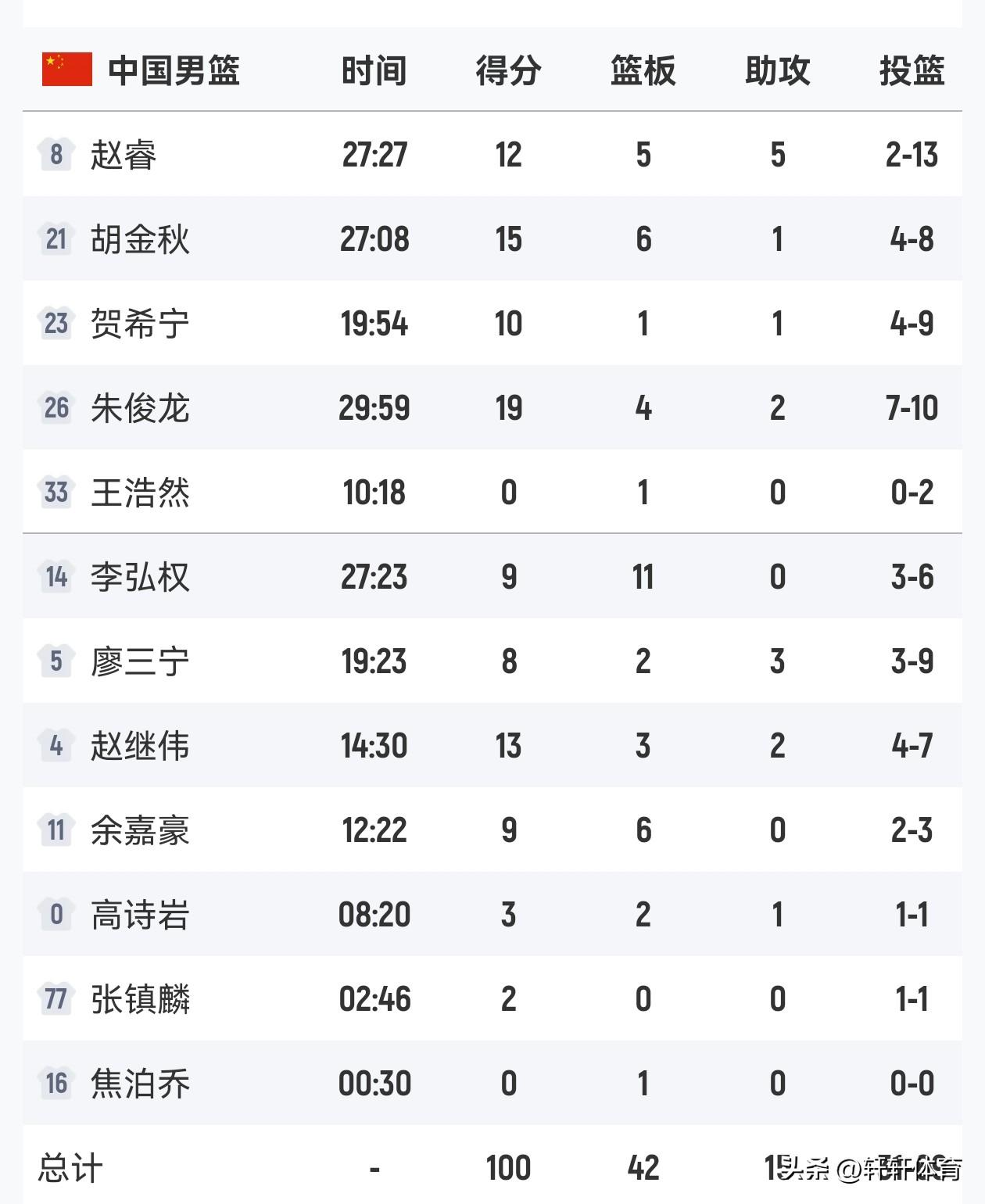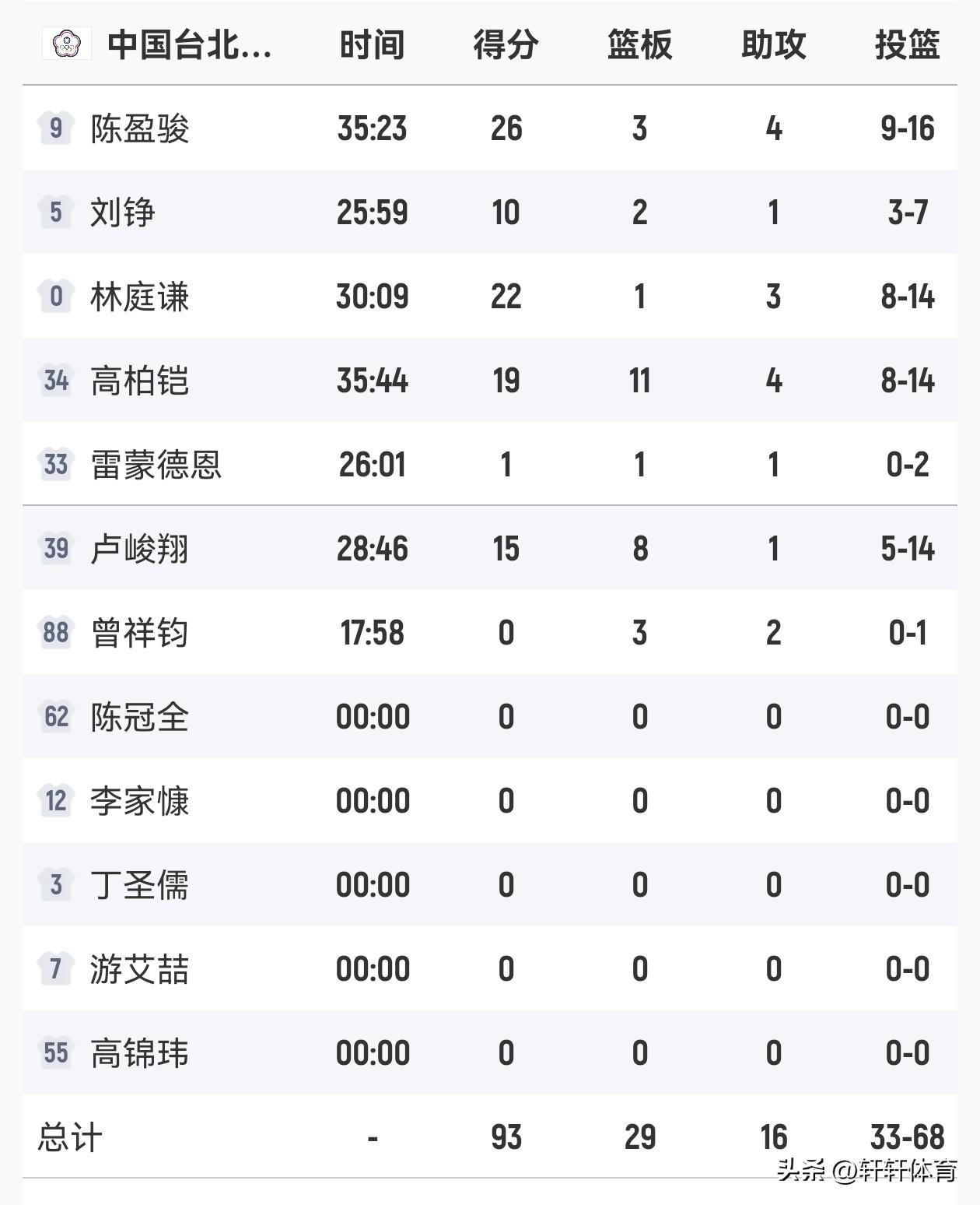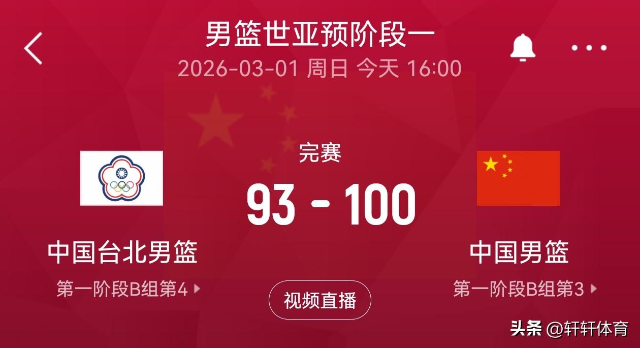 世预赛中国男篮快讯,在刚刚结束的中国男篮世预赛第四轮的比赛中以中国男篮以100-93艰难战胜中国台北男篮,本场比赛中国男篮高开低走,第一节凭借全员出色发挥以27-22领先中国台北男篮,但是第二节后半段台北男篮凭借陈盈俊以及外援高柏凯的稳定发挥,半场结束将比分反超以51-50领先中国男篮结束半场,第三节中国台北男篮延续第二节的发挥,单节领先中国男篮5分,三节结束中国男篮落后6分,第四节比赛中国男篮找回应有状态,单节仅让台北男篮得到16分,反观自己则高效轰下29分,一举将比分反超并取得最终胜利,本场比赛中国男篮12人均有出场,其中10人有得分入账,朱俊龙拿下了本队最高的19分,胡金秋15分,赵继伟13分,赵睿12分,贺希宁10分,李弘权余嘉豪各有9分入账廖三宁各有8分,高诗岩3分,张镇麟2分,中国台北男篮陈盈俊拿下全场最高的26分,林庭谦22分高柏凯19分。