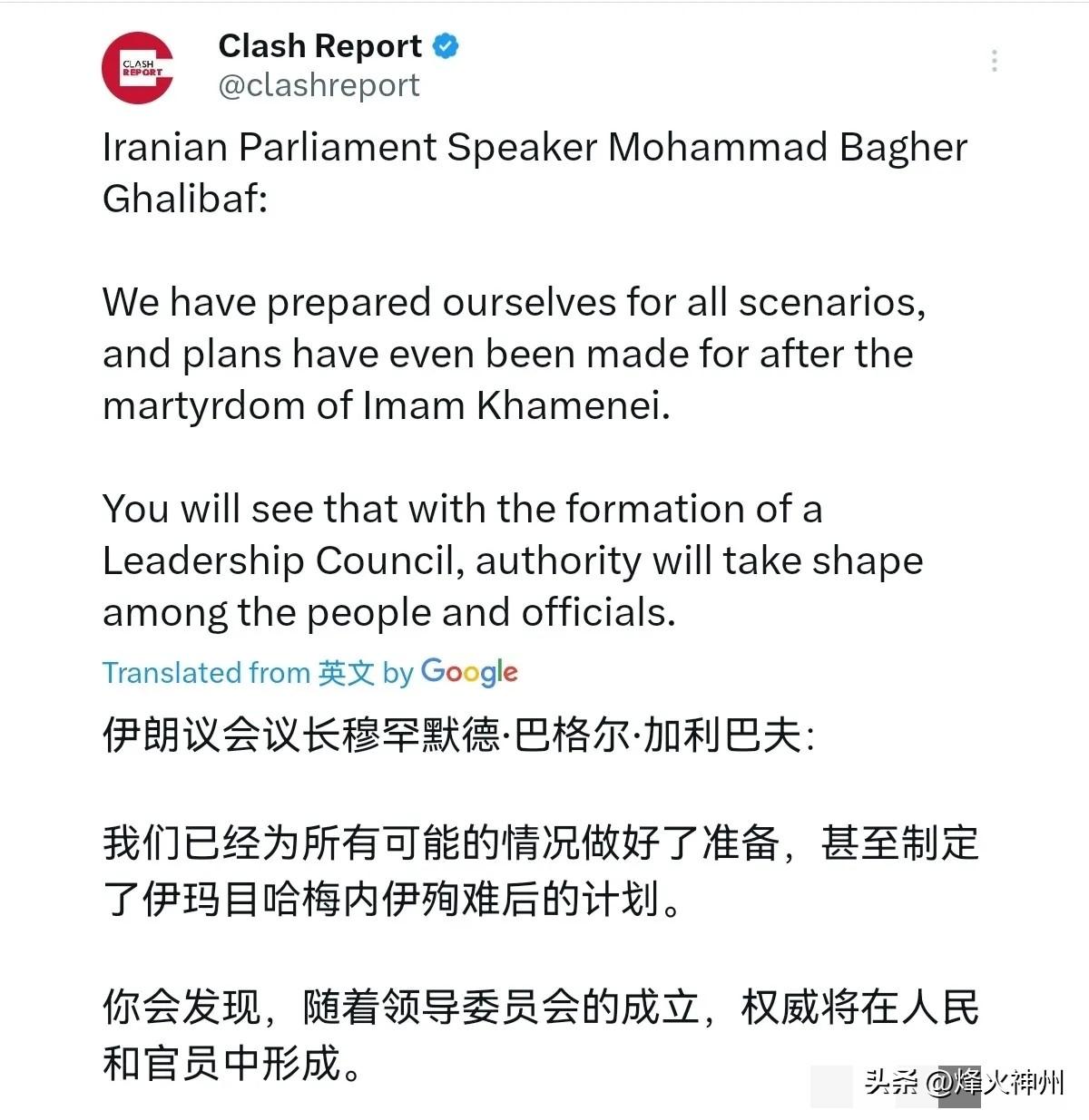 3月1日,在伊朗最高领导人哈梅内伊死亡之后,伊朗议会议长穆罕默德·巴格尔·加利巴夫表示,我们已经为各种情况做好了准备,甚至为伊玛目哈梅内伊殉难后制定了计划。你会看到,随着领导委员会的成立,人民和官员之间的权威将会形成。 评几句: 哈梅内伊的骤然离世,对伊朗而言是前所未有的巨大冲击。议会议长加利巴夫迅速表态“已为殉难后制定计划”,其核心目的在于对内对外释放维稳信号。 这一“预案”的公开,意在消除外界对权力真空的猜测,展现政权核心层应对突发危机的准备与决心。通过强调“领导委员会”的成立,加利巴夫试图构建一种制度化的权威过渡,将个人崇拜的突然中断,转化为集体领导的有序接续。这不仅是对国内民众的安抚,更是对潜在对手的威慑——伊朗的抵抗体系不会因一人之死而崩塌。