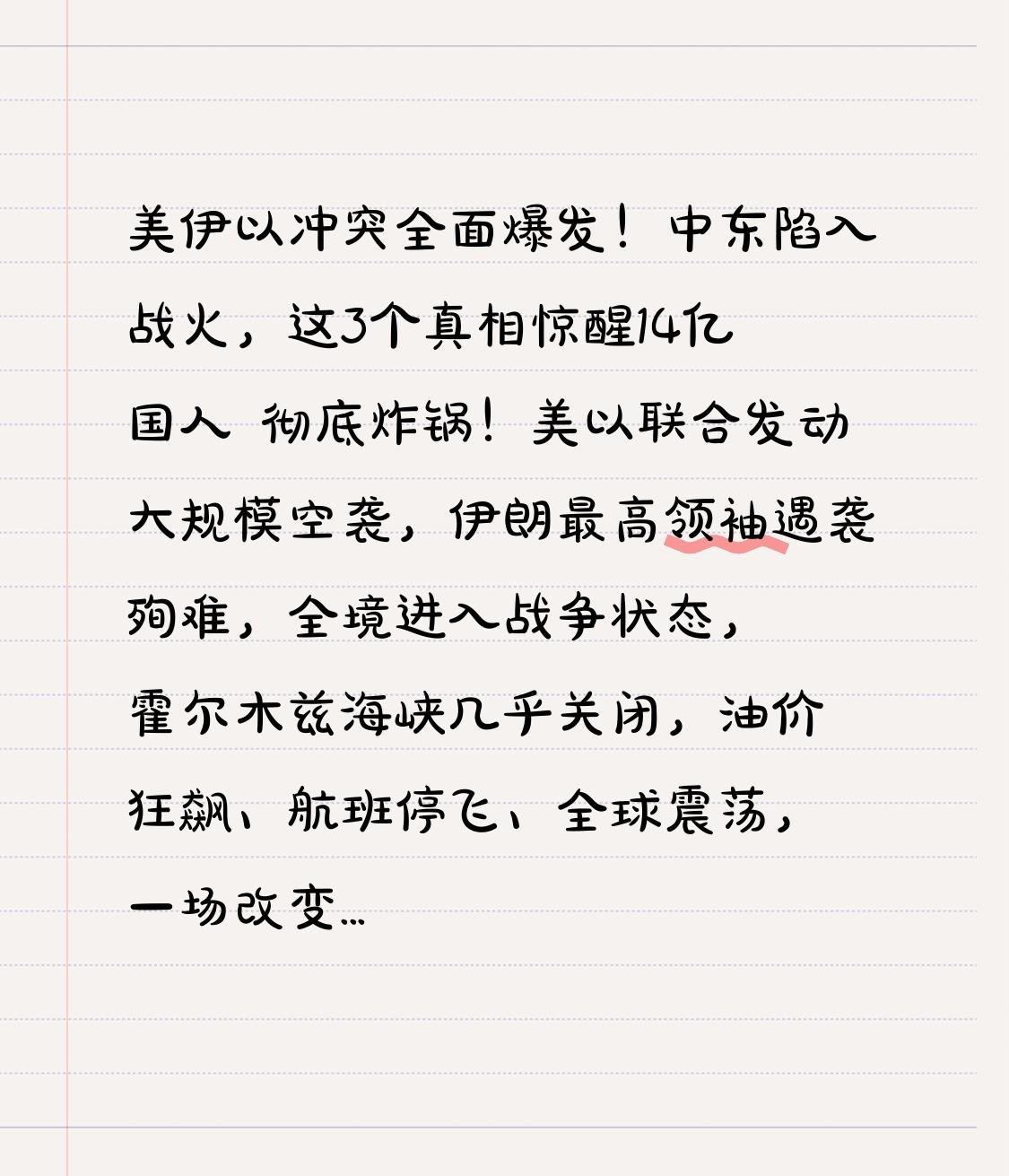 美伊以冲突全面爆发!中东陷入战火,这3个真相惊醒14亿国人 彻底炸锅!美以联合发动大规模空袭,伊朗最高领袖遇袭殉难,全境进入战争状态,霍尔木兹海峡几乎关闭,油价狂飙、航班停飞、全球震荡,一场改变世界格局的冲突,正在中东疯狂燃烧! 很多人还在隔岸观火,觉得战火离我们很远,不过是别国的恩怨纠葛。甚至有人认为,美国军事强大、以色列战力彪悍,几天就能结束战斗,伊朗根本无力反抗。 可当局势彻底失控,转折点来了! 伊朗没有崩溃、没有投降,临时领导层快速就位,启动“真实承诺-4”全面反击,导弹齐轰美以军事基地,真主党、胡塞武装等全线响应,战火从伊朗蔓延至阿联酋、伊拉克、巴林等多国,迪拜地标险遭袭击,中东彻底滑向全面战争深渊。 更让人清醒的是,这场冲突根本不是偶然:此前美伊日内瓦谈判即将达成协议,美以却一边谈和平一边发动突袭,彻底撕碎外交伪装。他们想靠武力颠覆政权、去军事化,却忘了战争没有赢家,强权带不来安宁。 轰炸摧毁的是建筑,留下的是无尽仇恨;导弹打不垮民族意志,只会让反抗更激烈。历史早已证明,越南、阿富汗的泥潭还未干涸,美国注定无法靠武力征服一个有骨气的国家。 这场战火也狠狠点醒我们:弱国无外交,乱世无安宁。没有强大的祖国,就没有安稳的生活;没有硬核的国防,就没有挺直的腰杆。我们不是生活在和平的世界,只是生活在和平的国家。 愿战火早日熄灭,愿平民远离伤害,愿霸权主义退场,愿每一个国家都能守住主权与尊严。 你认为这场冲突会如何收场?评论区说说你的看法。