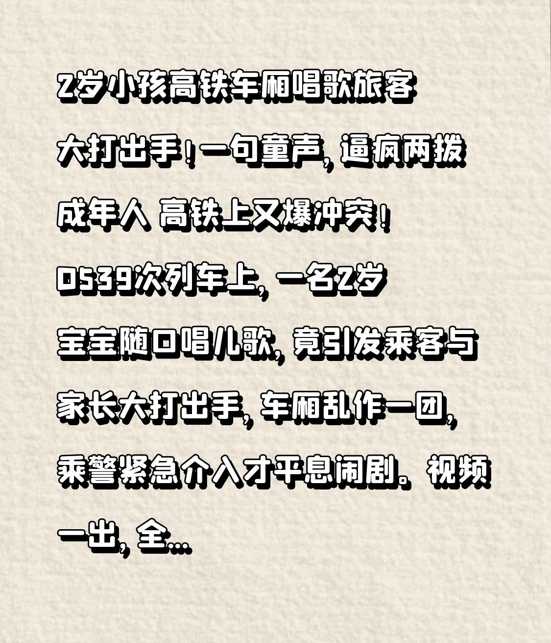 2岁小孩高铁车厢唱歌旅客大打出手!一句童声,逼疯两拨成年人 高铁上又爆冲突!D539次列车上,一名2岁宝宝随口唱儿歌,竟引发乘客与家长大打出手,车厢乱作一团,乘警紧急介入才平息闹剧。视频一出,全网吵翻:有人骂家长不管娃,有人怒批乘客太较真,真相到底是谁的错? 本来是再平常不过的旅途:孩子天真哼歌,童声没恶意;后排乘客想安静休息,也合情合理。谁都没错,可偏偏沟通一开口就变味——乘客强硬指责,家长护犊反击,几句话不对付,直接从口角变互殴,比孩子歌声吵一百倍。 本以为只是小摩擦,转折点来了!目击者曝料:孩子只是轻唱,家长也在轻声安抚,并非放任不管。乘客不找乘务员协调,上来就硬碰硬;家长被戳中痛点,立刻针尖对麦芒。两边都站在自己的道理里,把“小事”硬生生闹成“治安事件”,最后到站被民警分别护送,丢人又耽误行程。 这一幕太扎心:我们都在追求公共空间的舒服,却忘了公共场合最缺的是包容与好好说话。2岁孩子不懂规则,成年人该懂分寸;想安静没错,但动手就是违法;带娃不易,也该多顾及他人感受。 高铁不是某个人的私人空间,也不是发泄戾气的擂台。好好提醒能解决的事,别用指责;找乘务员能处理的问题,别用拳头。戾气解决不了噪音,只会制造更大的噪音;包容不是软弱,是最高级的教养。 出门在外,多一点换位思考,少一点情绪上头。愿每一趟旅途都少点冲突、多点温柔,别让一句童声,毁掉所有人的好心情。 你支持谁?觉得高铁带娃该被包容吗?评论区说说。