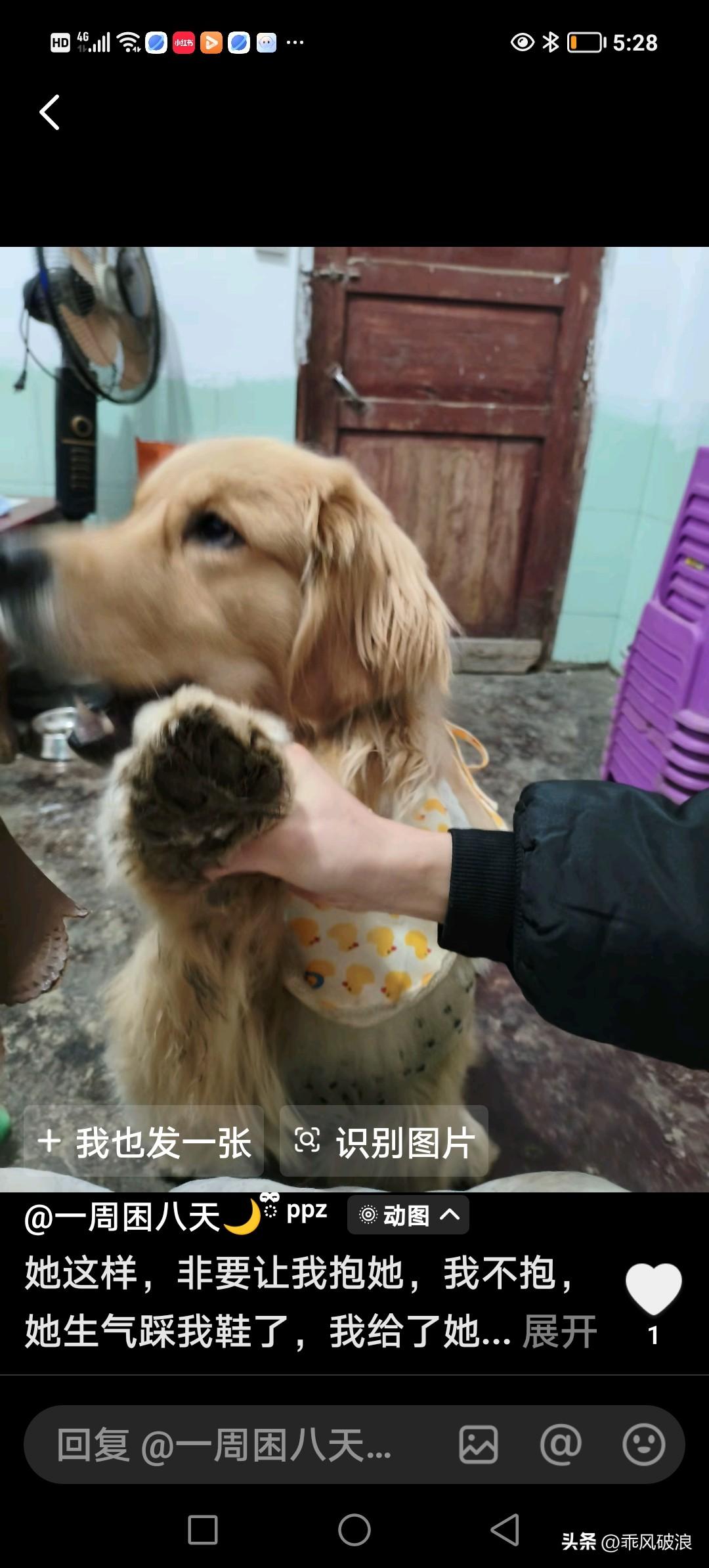 狗狗想要我抱抱,我没抱它,它就咬我的鞋。我一把抓起它的一只前脚,气呼呼地给了它一