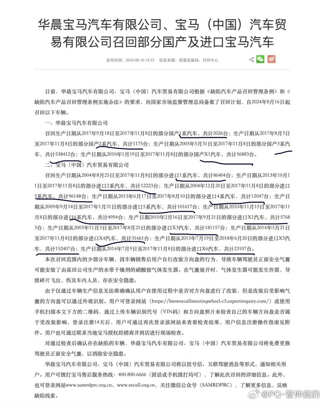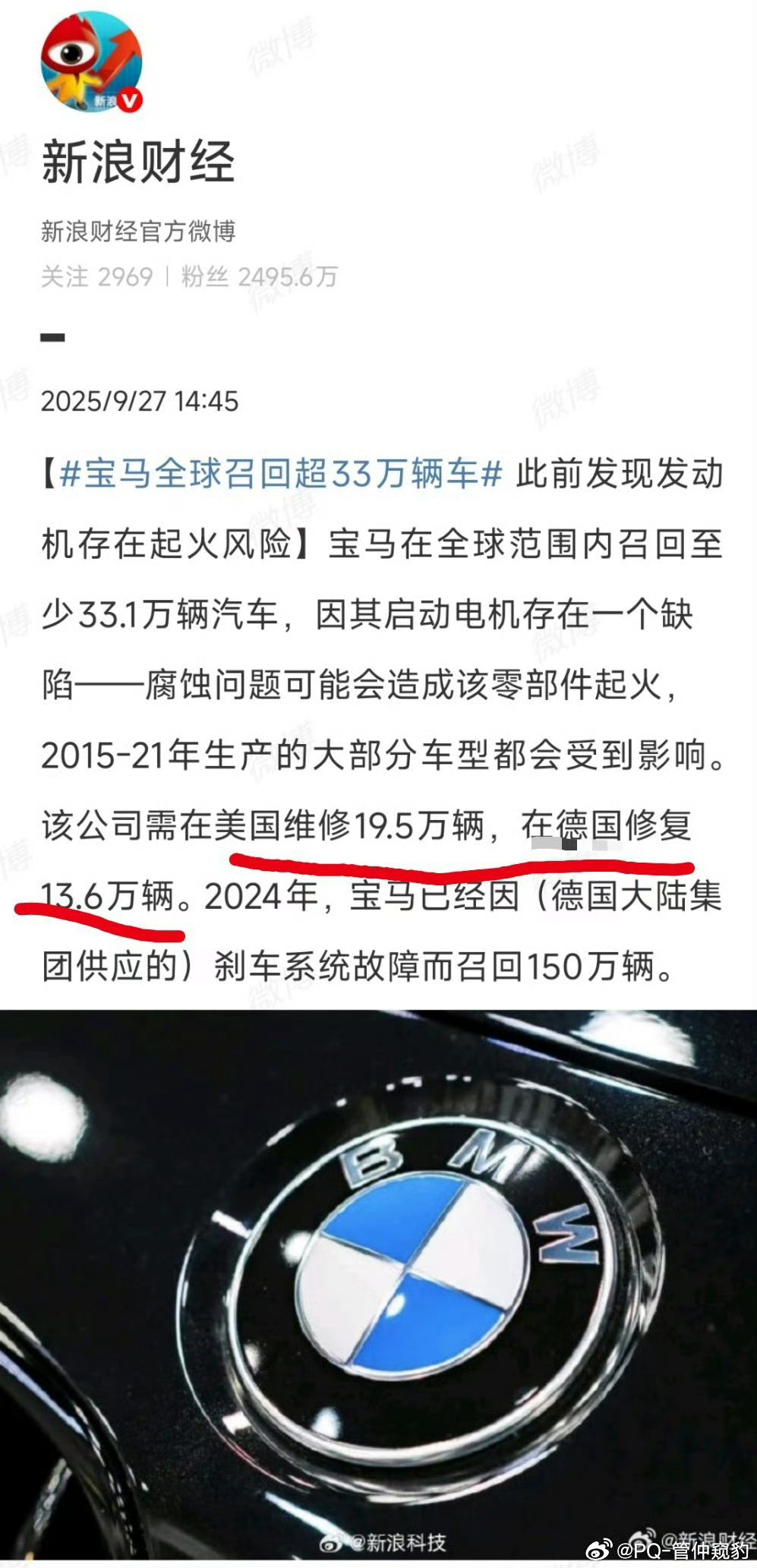 宝马因起火隐患召回近34万辆车宝马每年一召回呀25年因启动机缺陷腐蚀可能引发起火召回24年因为高田气囊问题召回