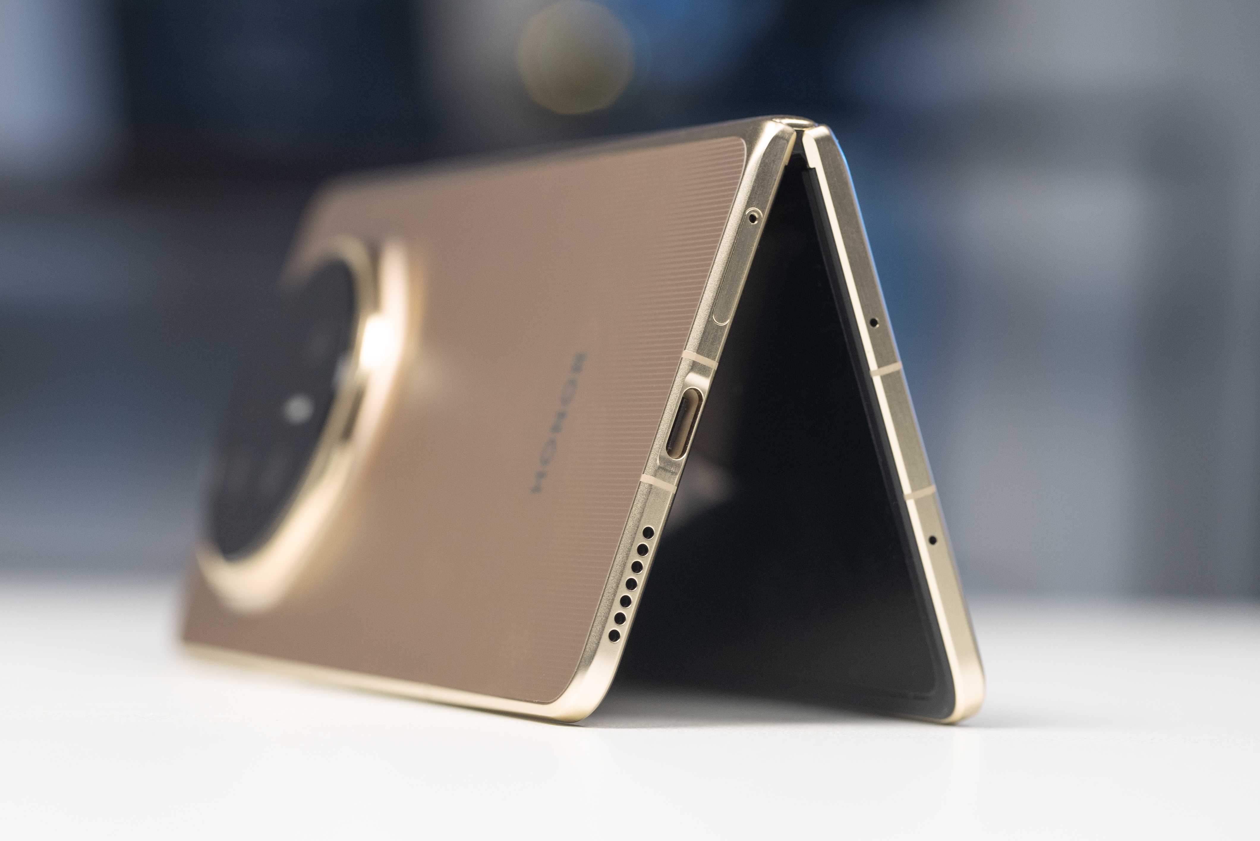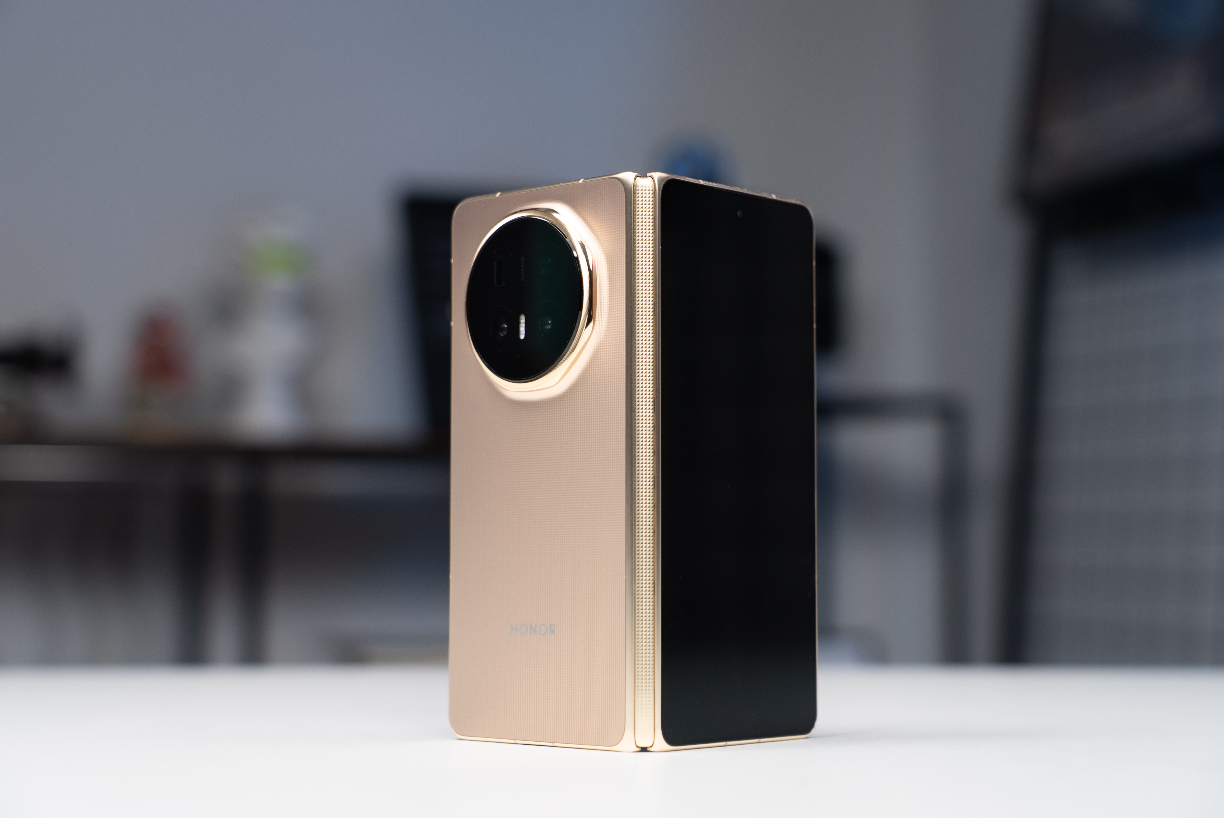 收到了荣耀Magic V6 旭日金机身依旧非常轻薄,重量 219 克,展开厚度 4 毫米,折叠起来厚度 8.75 毫米。