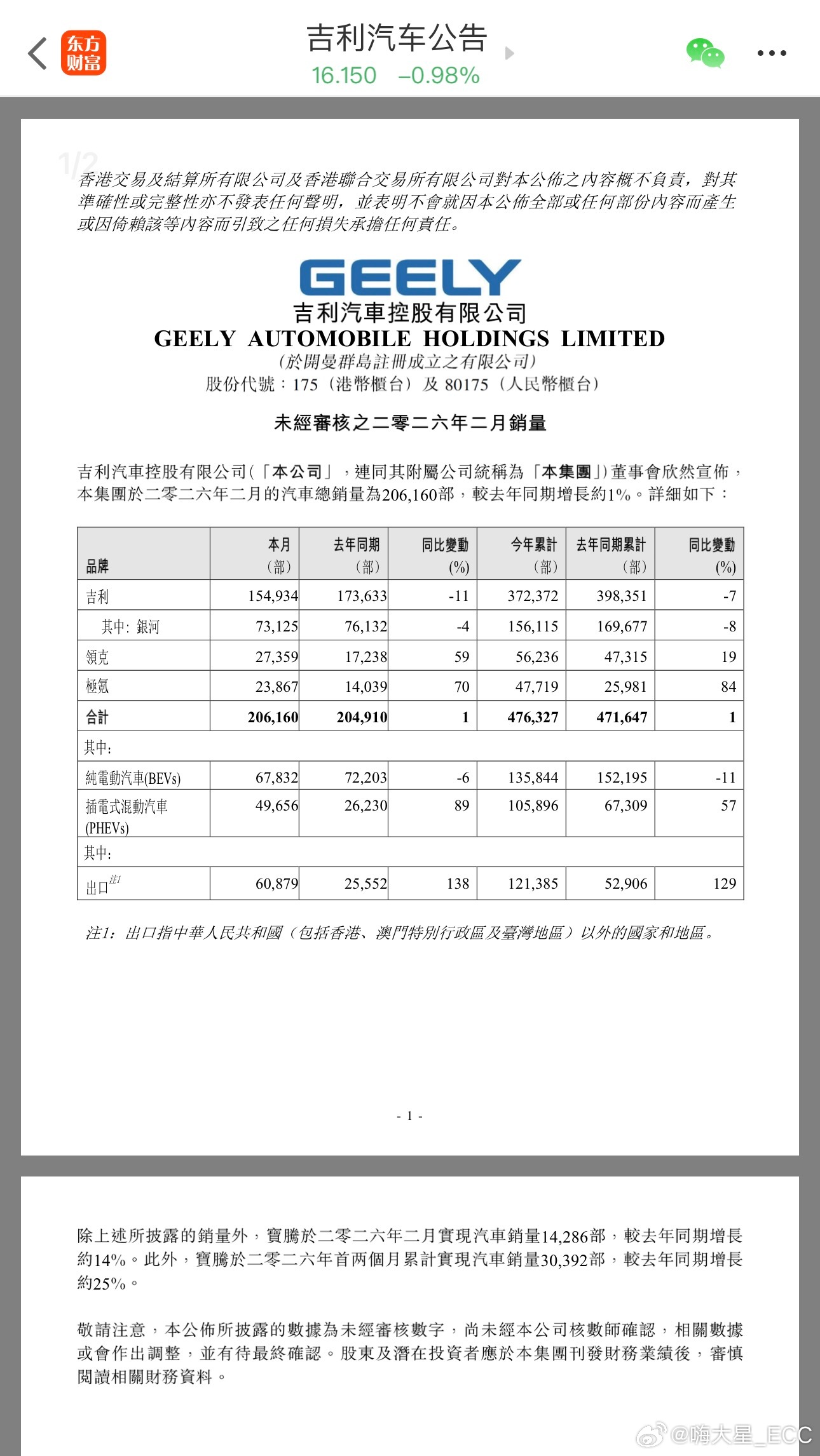 吉利汽车 2月销量206,160台,26年1-2月累计销量和去年基本持平,但结构有很大变化,高端化、新能源、全球化趋势很明显。