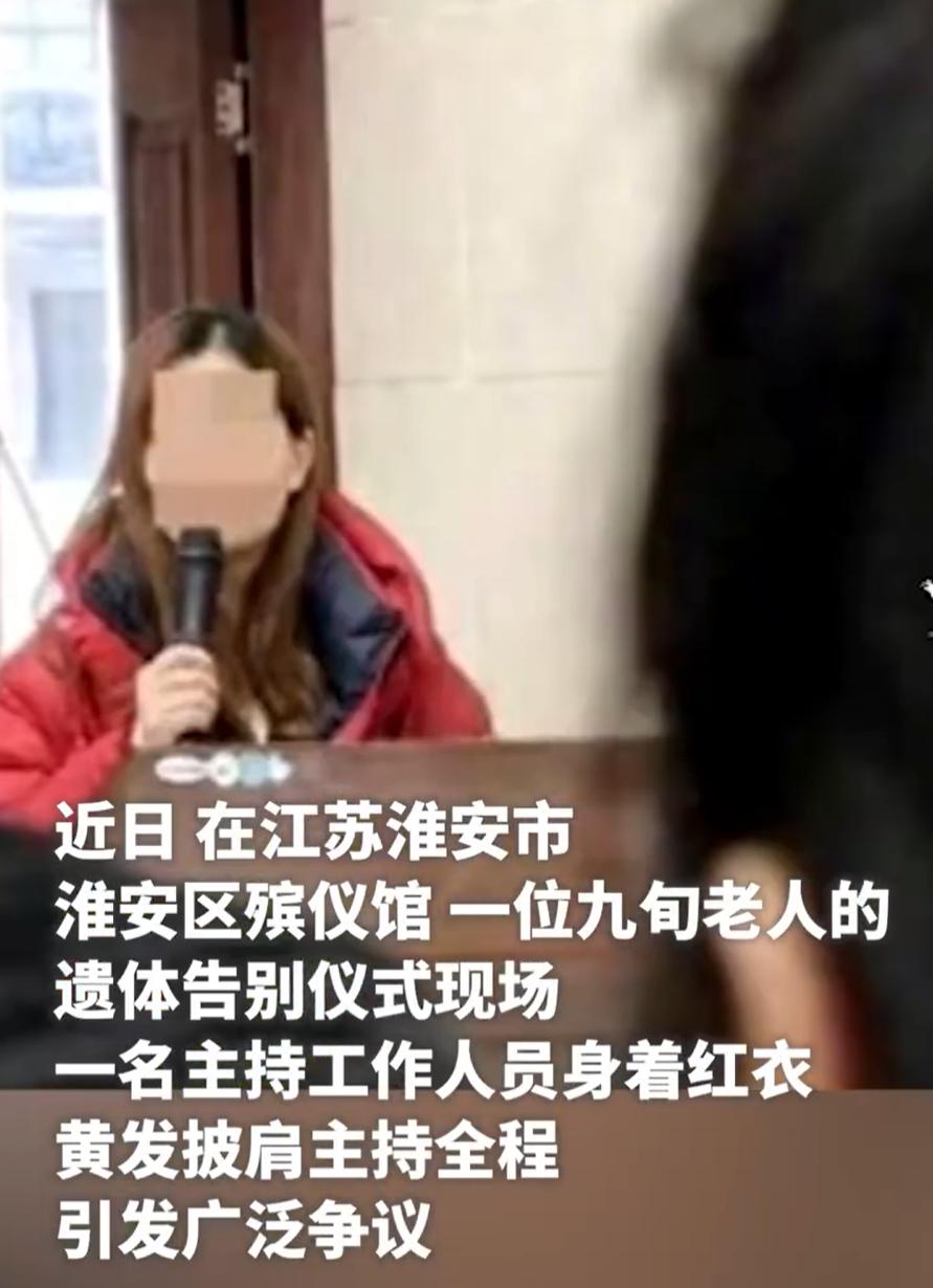 太离谱了!江苏淮安,男子家中的九旬老人去世,出殡当天,一家人的心情原本非常沉痛,谁知殡仪馆的主持人还穿着红色棉袄来主持老人的告别仪式,男子这下彻底忍不了了,直接把事情曝光到问政江苏讨要说法 男子介绍,当天一位九旬老人去世,出殡当天,全家人都沉浸在深深的悲痛中。谁知在告别仪式上,主持仪式的工作人员竟然穿着一件红色棉袄,还披着一头黄发,就这么站在灵堂前主持追悼会 红色代表着喜庆、热闹,而葬礼是庄重肃穆的场合,需要的是素雅、凝重。一件红棉袄出现在灵堂前,这种强烈的视觉冲击和情感反差,让这位男子彻底怒了。他直接把这事曝光到了问政江苏平台,要讨个说法 事情发酵后,殡仪馆负责人出面回应。原来这位红衣黄发的主持人已经在该馆工作约10年,是劳务派遣人员。负责人解释说是节后思想松懈,没有严格执行服务规范,他们已经登门向家属道歉 收到道歉后,这位男子也表示不愿继续追究,不想再浪费精力 对此,还是有网友表示不理解:殡仪馆的工作人员难道不知道葬礼该穿什么吗?干了10年的人,怎么会犯这种低级错误?节后思想松懈这个理由,真的站得住脚吗? 其实这也不是大家较真,严格来说,殡仪馆是送别逝者的最后一站,工作人员的一言一行都关乎家属的情感寄托。在这个特殊的场合,专业和尊重比什么都重要。穿着得体不仅是对工作的基本要求,更是对逝者和家属最基本的尊重 对家属来说,亲人的告别仪式只有一次,任何瑕疵都会成为永远的遗憾。对殡仪馆来说,每一次服务都是对生命最后的致敬,都应该怀着敬畏之心去完成