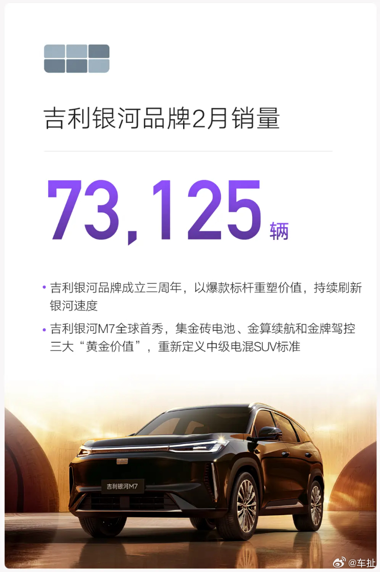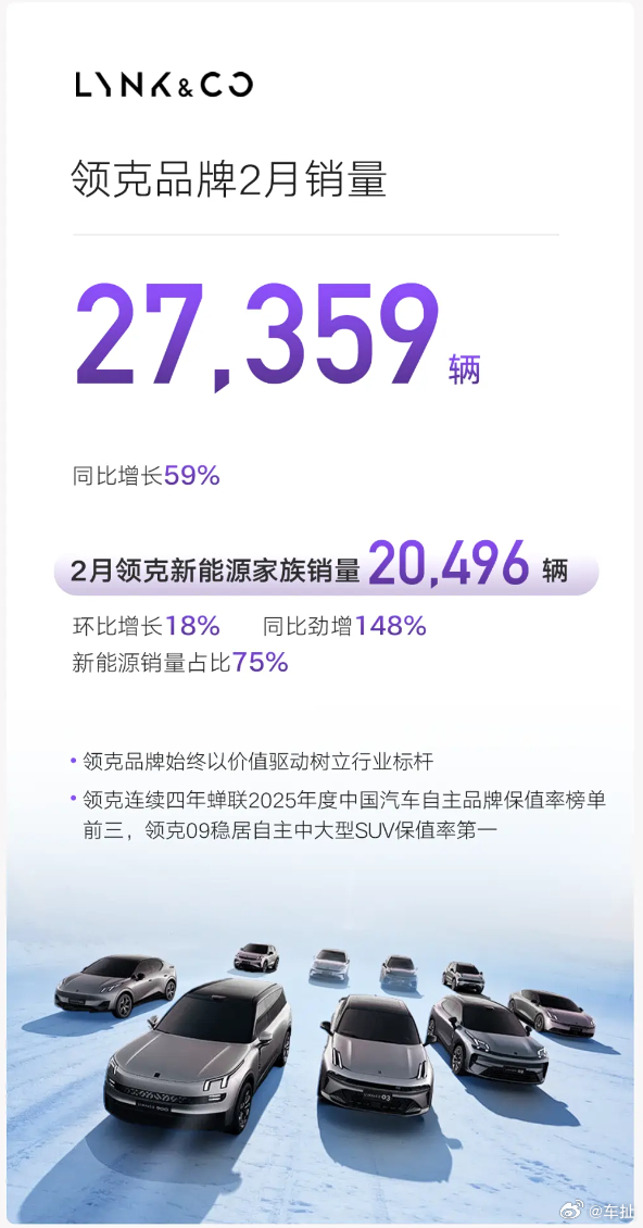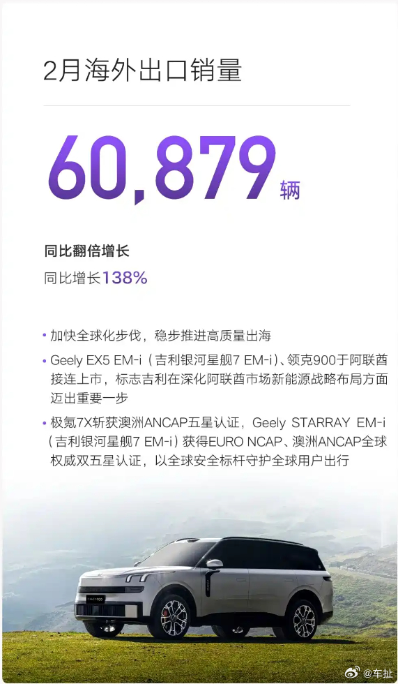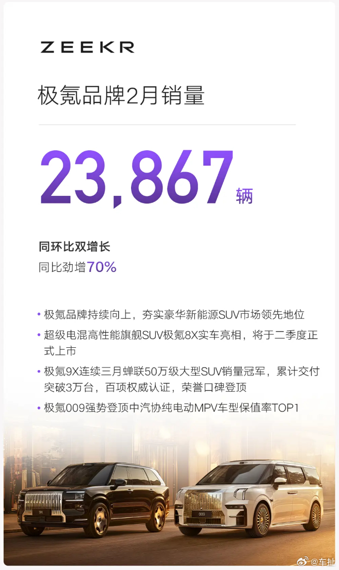 吉利2月销量达到20.6万辆,其中新能源销量11.7万辆超过一半。具体品牌上,吉利银河73,125辆,领克27,359辆,极氪23,867辆,另外海外出口也达到60,879辆。没想到继1月的强势表现后,吉利在2月这个最大的淡季也拿出了这么好的成绩,今年开了个好头。吉利汽车