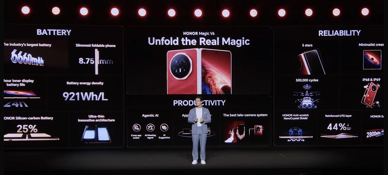 MWC 2026,超薄折叠屏旗舰荣耀Magic V6正式在海外发布,机器人手机RobotPhone正式首秀。 荣耀Magic V6亮点: 8.75毫米厚,6600毫安时电池 4款颜色,IP68&IP69防尘防水,强度与耐刮性提升 32%硅含量的青海湖电池,能量密度921/L 7.95英寸内屏,UTG玻璃,50万次折叠耐用性测试 满血版第五代骁龙8至尊版处理器 1/2英寸潜望长焦,CIPA 6.5防抖 整体来说,Magic V6相比Magic V5提升不算大,二者推出时间仅相隔7个月,讲真也难有大的突破。对了,据说年底Magic V7计划推出。荣耀Magic V6 MWC 2026