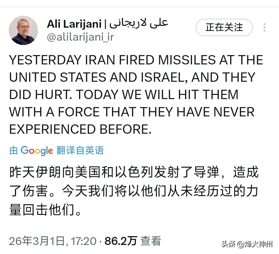 哈梅内伊指定的“战时接班人”拉里贾尼刚刚(北京时间3月1日17:20)写道:“昨天伊朗向美国和以色列发射了导弹,造成了伤害。今天我们将以他们从未经历过的力量回击他们 评几句: 伊朗方面拉里贾尼发表的强硬对抗言论,非但不能解决任何矛盾,反而会将本已动荡的中东推向更大灾难。宣称已发动打击、并扬言以“前所未有的力量”继续回击,本质上是不计后果的挑衅,只会让地区冲突彻底失控。 靠激进言论与军事对抗解决分歧,从来都是危险且短视的选择。一味升级对立、煽动报复情绪,最终只会让无辜民众承受苦难,让地区安全秩序彻底崩塌。当前国际社会最需要的是降温、对话与克制,而不是火上浇油的极端表态。 这种不顾全局、只图一时强硬的做法,既不符合和平发展的时代潮流,也会让伊朗自身陷入更深的孤立与危机。真正的智慧不是炫耀武力,而是懂得在危机关头保持克制。