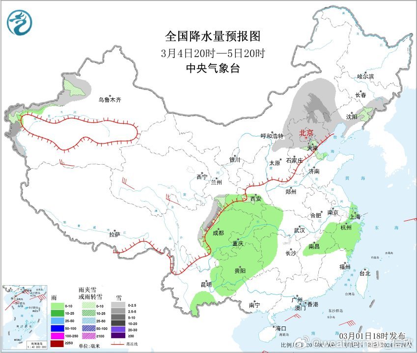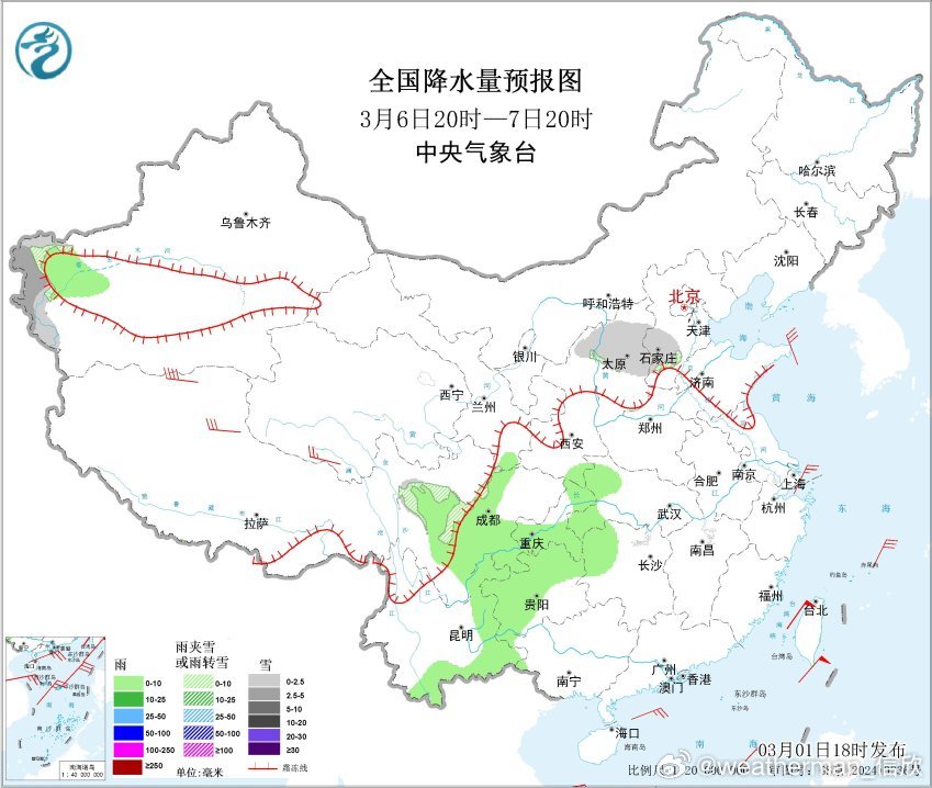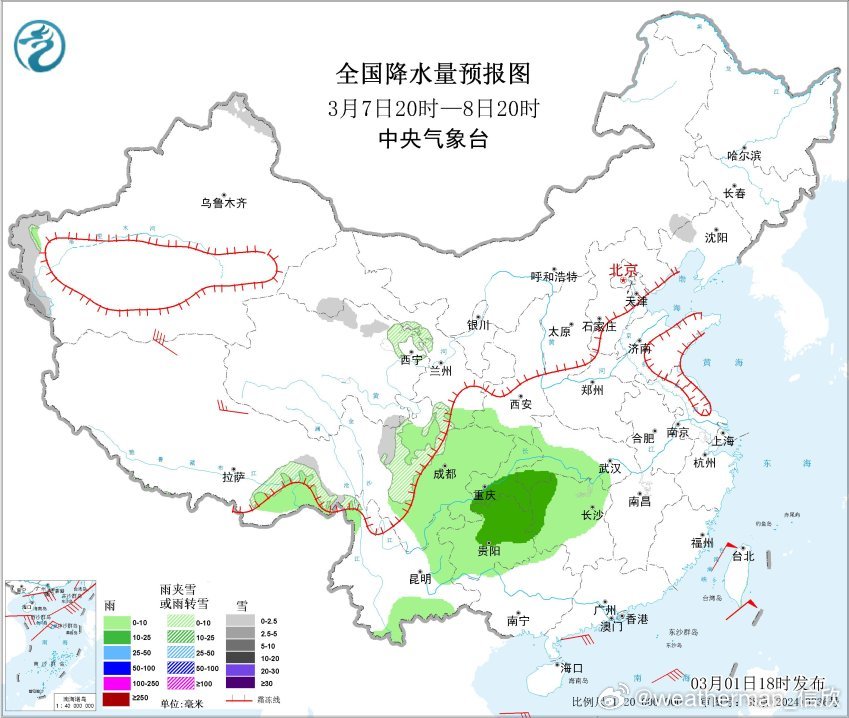 3月2日晚-3日,广东东部等地部分地区有暴雨(50~70毫米)。之后我国的降水总体不强。4-8日阴雨主要在四川重庆贵州一带。