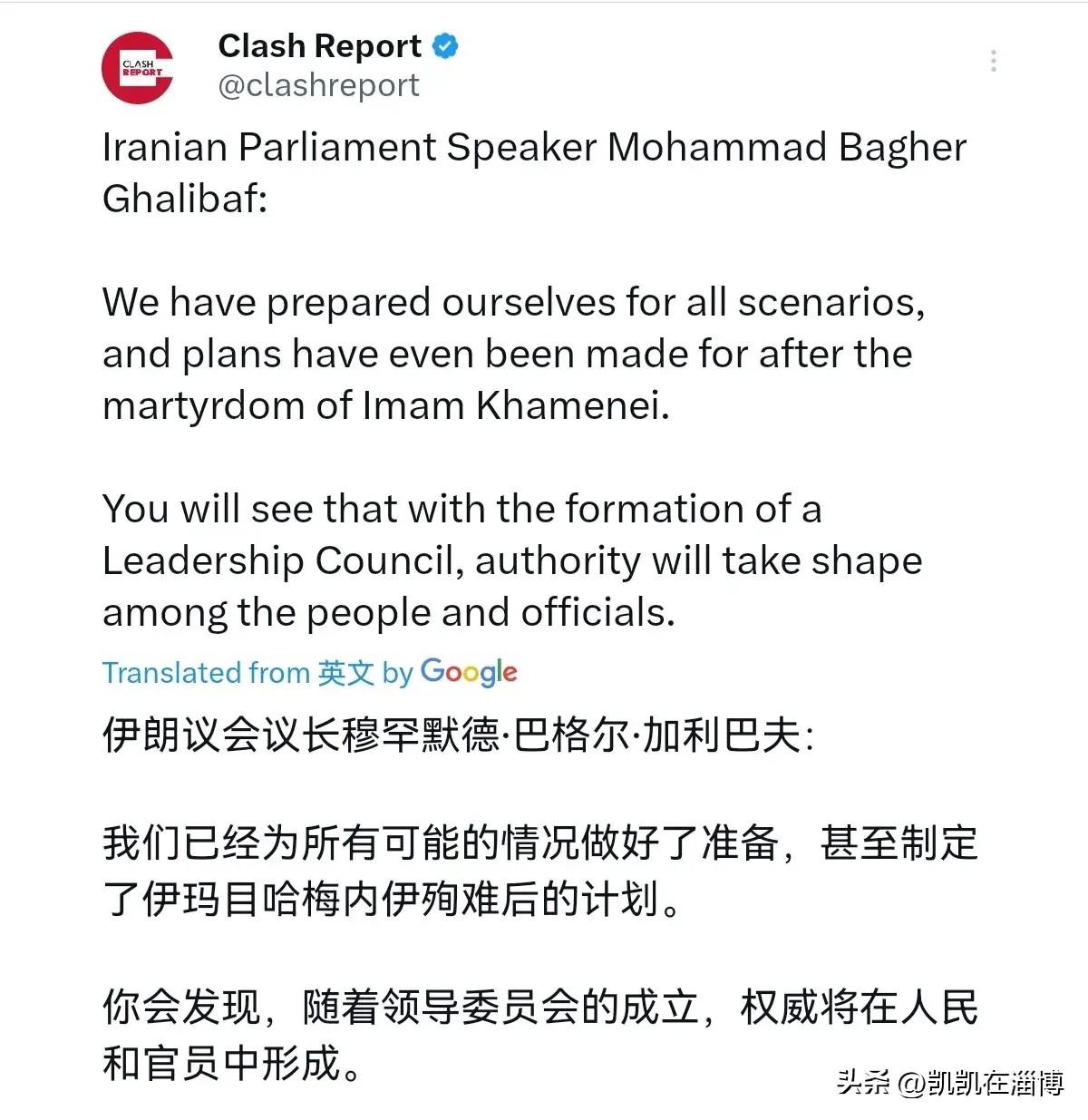 美国和以色列的算盘落空了,伊朗果然有预案!3月1日,在伊朗最高领导人哈梅内伊死亡之后,伊朗议会议长穆罕默德·巴格尔·加利巴夫表示,我们已经为各种情况做好了准备,甚至为伊玛目哈梅内伊殉难后制定了计划。 美以的“斩首”炸弹刚落下,德黑兰的哀乐就响起来了。伊朗最高领袖哈梅内伊确认在空袭中殉难,这对伊朗来说,无异于被抽掉了“主心骨”。这位执掌伊朗最高权力长达37年的宗教领袖,不仅是国家的象征,更是整个“抵抗轴心”的精神支柱。他的突然离去,带来的震撼和权力真空,是1979年伊斯兰革命以来前所未有的。 就在举国悲恸、黑旗低垂的关头,伊朗议会议长穆罕默德·巴格尔·加利巴夫站了出来,对着全国发表电视讲话。他的话很硬气:“我们已经为各种情况做好了准备,甚至为伊玛目哈梅内伊殉难后制定了计划。” 这意思再明白不过了:你们以为炸掉了领袖,伊朗就会乱套、就会投降?想得太简单了,我们早有安排。 哈梅内伊对伊朗有多重要?这么说吧,过去三十多年,伊朗的内政外交、军事战略,甚至社会文化的走向,都深深烙着他的印记。他是最高决策者,是革命卫队的最高统帅,也是千万什叶派信徒的精神领袖。美以这次不惜代价实施“斩首”,赌的就是群龙无首后,伊朗政权会从内部瓦解。但加利巴夫的讲话,第一时 间就给这个算盘泼了盆冷水。 根据伊朗宪法,最高领袖去世后,会由总统、司法总监和宪法监护委员会的一名法学家组成临时委员会,代行职权,直到专家会议选出新领袖。而据外媒报道,哈梅内伊早在几个月前,就因应日益严峻的安全威胁,秘密部署了一套“四层继任体系”,为关键军政职位指定了多达四名后备人选,并授权了一个由核心亲信组成的圈子,在紧急情况下做出决策。也就是说,从法律程序到实际运作,伊朗高层对“后哈梅内伊时代”并非毫无准备。 站出来讲话的加利巴夫本人,就是个分量极重的人物。他今年65岁,是伊朗强硬保守派的核心。他可不是普通的文官,而是前革命卫队空军司令出身,带过兵打过仗,后来还当了12年的德黑兰市长,政绩和威望都很高。2020年他当选议会议长,一直是哈梅内伊的核心亲信之一。在这个节骨眼上,由这样一位兼具军方背景、政治经验和强硬立场的人物出来稳定局面,本身就传递出强烈的信号:军政体系依然稳固,指挥链条没有断。 所以你看,一边是国葬的肃穆,另一边是权力交接程序的迅速启动。这恰恰说明,哈梅内伊的重要性不仅体现在他个人权威上,更体现在他生前为维护政权稳定所构建的这套制度韧性上。有中东问题专家分析指出,伊朗的政治权力结构,早已不是围绕单一个体运转的封闭系统,哈梅内伊及其团队在有意识地分散权力,为各种突发情况做了预案。他的离世是巨大打击,但未必会导致体系瞬间崩塌。 小编觉得,美以的“斩首”行动,在战术上或许取得了惊人成功,但在战略上却可能踢到了一块铁板。哈梅内伊之死无疑会激发伊朗更强烈的复仇情绪,而一个早有预案、权力过渡机制正在启动的伊朗,其后续的反击很可能不是仓促和混乱的,而是更有组织、更持久的。这场冲突,因为一位领袖的陨落,正滑向更不可预测、也更危险的深渊。伊朗这盘棋,还没到认输的时候。