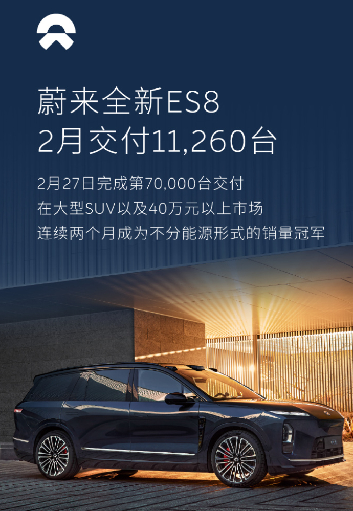 蔚来2月交付超2万台,是个不错的成绩,而且这其中超一半都是旗舰车型ES8,也充分