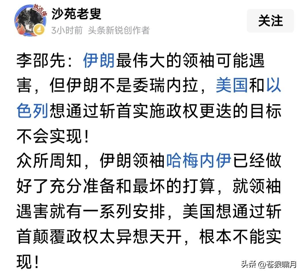 美以初战告捷,哈梅神主与40名军政高官殒命!网友推出李绍先专家对此评论,令人大跌眼镜惊掉下巴。 李专家说:伊朗最伟大领袖可能遇害!但伊朗不是委内瑞拉,美以妄想通过斩首,实施政权更迭不会实现! 众所周知,哈梅内伊已对美以打击,做了充分准备与最坏打算,并就领袖可能遇害有一系列安排!美以想通过斩首,颠覆伊朗政权,是异想天开! 苍狼翻出不少专家,对于美以打击伊朗神权的评论,感觉大陆专家的水平,还没有台湾的评论员看得准呐! 比如台湾名嘴蔡正元说:由于整体实力悬殊太大,美伊若开战,伊朗撑不过四天!这不刚开打,哈梅神主和几十名高官都身亡了!继续打会怎样? 比如沈逸教授说:美以这次袭击伊朗,难以取得胜利!他耗得起吗? 比如李莉专家说:美国敢打伊朗,伊朗就打以色列,半小时就解决! 苍狼记得这次开战前,我们不少专家都说美以只是咋呼威胁,逼伊朗就范,同意三个条件,但绝对不敢打! 只有蔡正元敢于反潮流:美以打击伊朗准备已久,只要伊朗不接受条件,他们必打无疑。不打才是奇怪事! 结果事实验证,蔡博士预测准确!我们一众专家教授,全傻眼了!不知他们看到初战结果,会有什么感想? 当然伊朗也对以色列与美军基地,发射导弹进行了反击!但比起自己遭受的损失,谁小谁大?何况这种反击,会招来更猛烈报复,结果更难承受! 随后事情发展,可能恢复谈判!谈不拢再打,打打再谈?美以不会与伊朗磨时间,他们只想更换伊朗“神权”,变成亲美政权,实现民主法治社会! 这个愿望能否实现?不可知不乱说,一切皆有可能!但如李绍先专家所言,是否预测太早太绝对了呢?如果伊朗人民希望改变,谁能拦阻得了呢? …………