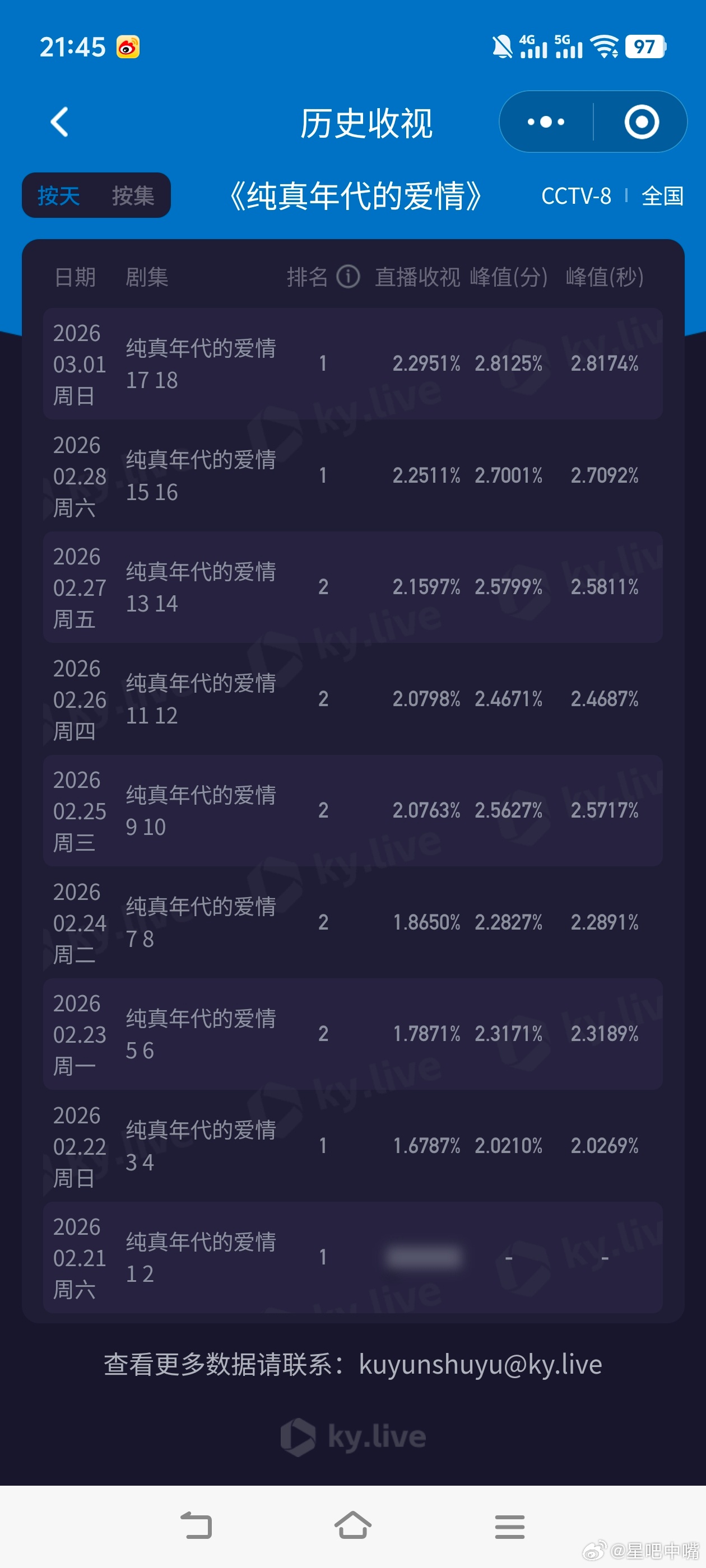 纯真年代 地震剧情又双叒叕新高!陈飞宇 孙千《纯真年代的爱情》周日收视快报!峰值2.8174,平均2.2951,开播以来天天创新高!