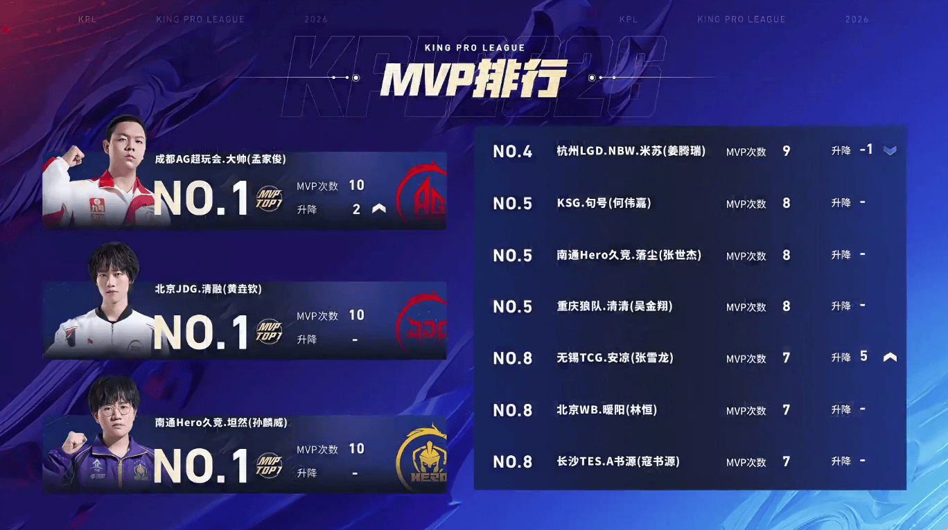 AG大帅11(孟家俊)、JDG清融v(黄垚钦)、南通Hero久竞_坦然(孙麟威)累计获得10次MVP,并列第一;