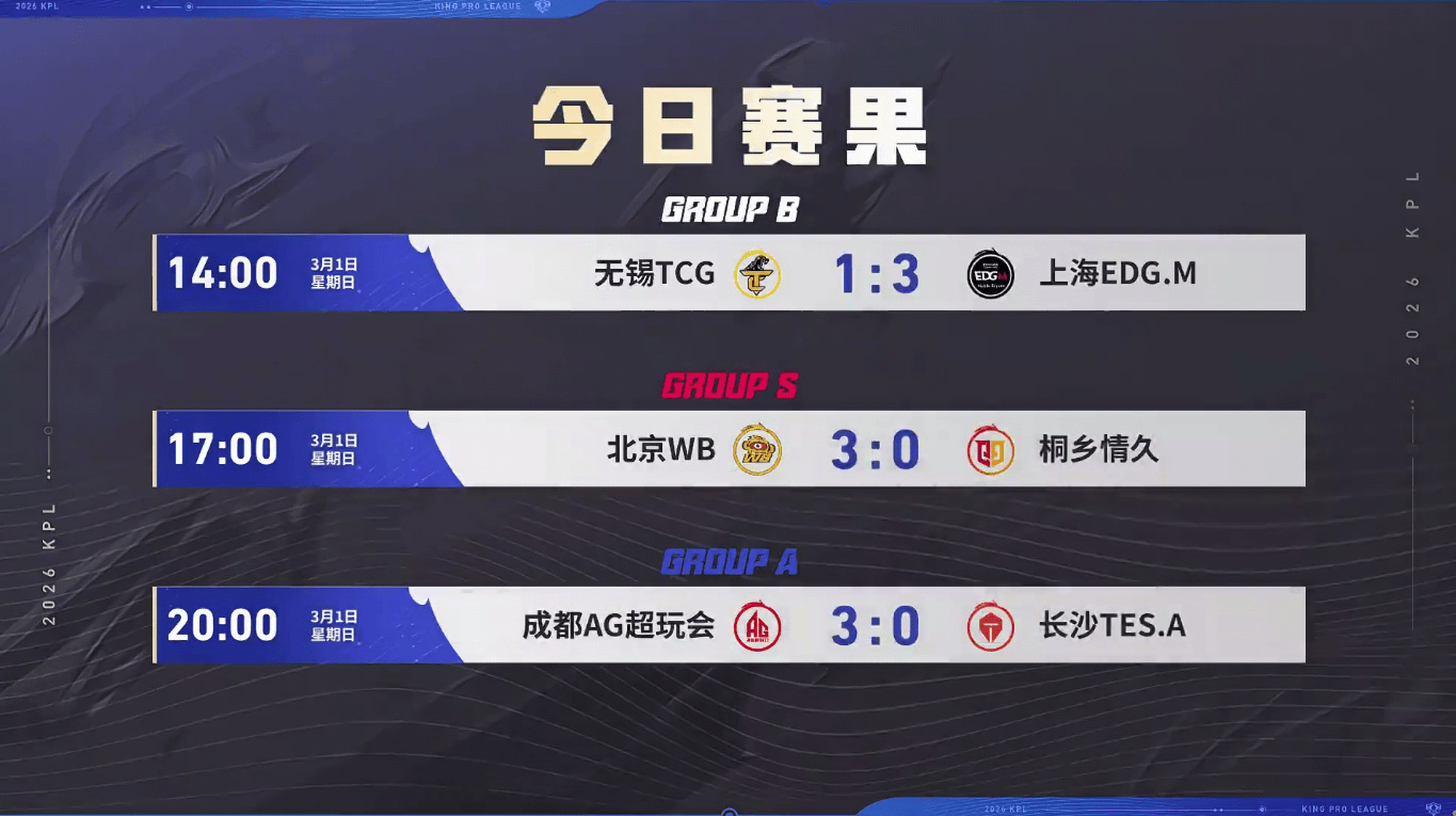 虎扑03月01日讯[赛果]狼/WB/KSG战绩S组前三,大帅/清融/坦然MVP榜并列第一