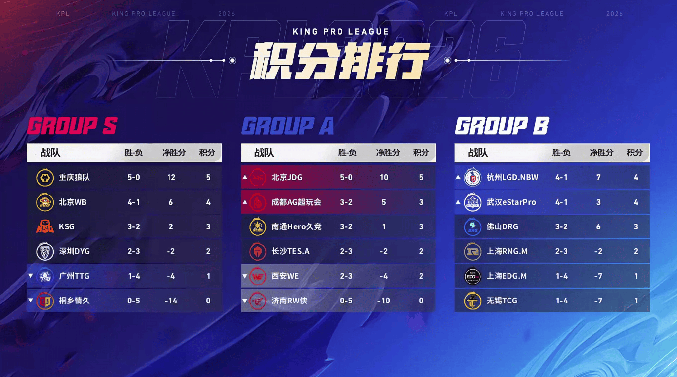 北京JDG王者荣耀分部5胜0负,净胜分10分,积5分,居于A组头名;