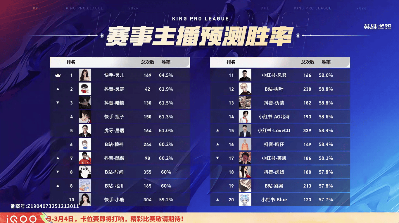 快手-灵儿胜率64.5%,位于排行榜第一。