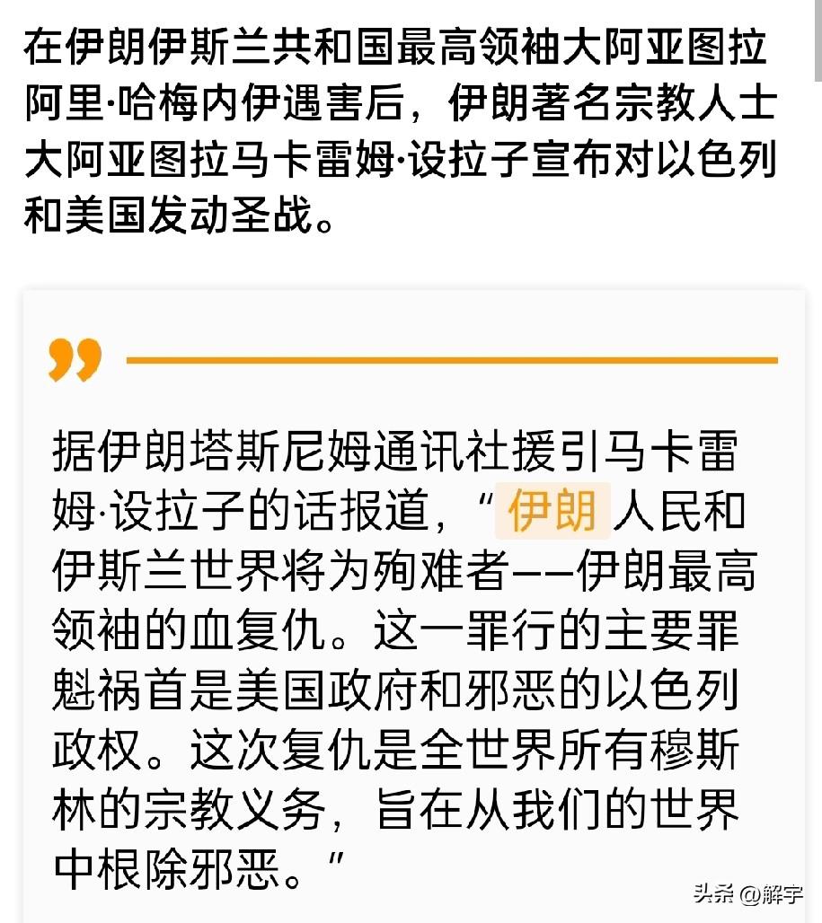 伊朗宣布对美国和以色列进行圣战!美以将尝到人民战争的威力! 当今世界最有影响力的什叶派最高宗教领袖大阿亚图拉马卡雷姆·设拉子在哈梅内伊确认遇害后宣布对以色列和美国发动圣战(具体内容见图三)。对于美国和以色列而言,这可能就是他们灾难的开始,因为这道向美国和以色列进行圣战的命令,所覆盖的人群,是足足多达19亿人口的穆斯林信徒,更为关键的是,这19亿穆斯林信徒分布遍及全球,美国境内有,以色列推内亦有,中东地区更是他们的大本营。千万别小看穆斯林宗教领袖对穆斯林信徒的强大号召力,而今在中东地区黎巴嫩武装组织宣布参战,伊拉克民众冲击美使馆区,巴基斯坦民众冲击美国领事馆造成9死18伤等等事件,都说明穆斯林信徒正在号召中爆发他们对美以无底线偷袭的愤怒。照此趋势发展下去,美以将尝到人民战争的威力,陷入重重包围之中!