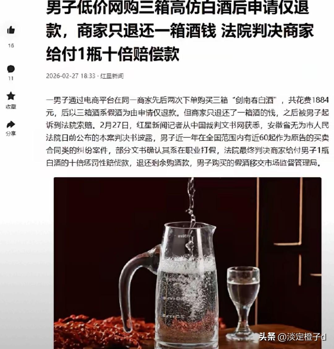 安徽李某买3箱假剑南春索赔,最终只拿到2296元赔偿。 2025年6月,李某刷电商平台,发现一家店剑南春价格格外便宜,先花628元买1箱,商家页面标着“口感和真酒相似90%”,还问他“知道是什么酒吧”,李某揣着明白装糊涂没吭声。隔两天他又花1256元买2箱,还直接问商家“这是高仿吗”,商家直言“是,不然哪这么便宜”。 李某找机构鉴定,三箱全是假酒,申请仅退款遭拒,商家只退1箱钱,平台也拖着不处理。他拿着鉴定报告起诉,索赔13816元,没想到法院一查,他近一年打了近60起打假官司,是个实打实的职业打假人。 新观点很明确,职业打假也得守规矩。法律保护正常消费维权,就像给维权装了层“过滤网”,只留正当需求,滤掉投机牟利。商家售假该罚,但李某明知是假还故意多买,超出合理消费范围,不算普通消费者。 小困惑彻底解开。有人疑惑商家售假为啥李某索赔不全成,答案是他买酒不是自己喝、送礼,而是奔着索赔赚钱,不符合法律保护消费者的初衷。 情绪共鸣很直接,外人看李某这操作都觉得解气,既没让售假商家蒙混过关,也没让他钻法律空子,算是两头不偏。 法院最终判决,支持1瓶酒的十倍赔偿1040元,加上未退的1256元,共2296元,假酒移交市监局。李某本想赚一笔,结果偷鸡不成蚀把米。 你觉得法院这判决合理吗?