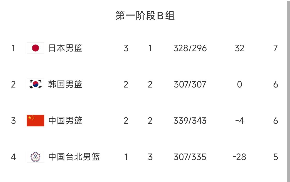 随着中国男篮7分险胜中国台北,以及日本78-72击败韩国。世界杯亚洲区预选赛,第一阶段B组最新积分榜出炉。中国男篮暂列小组第三。 中国男篮在困境中,打出团结的篮球,团队的篮球!在打完第二窗口期比赛之后,今年7月,中国男篮将在主场先后迎战日本,中国台北。按照规则,小组前三名晋级第二阶段