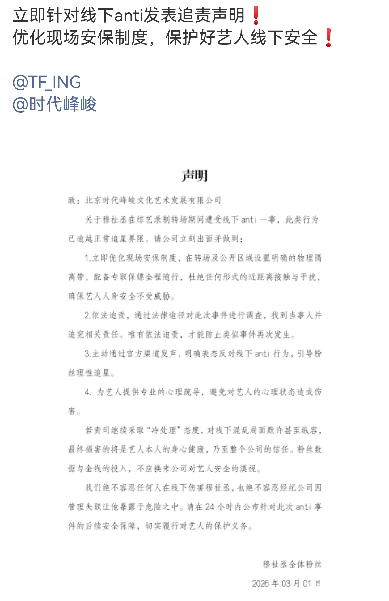 穆祉丞全体粉丝要求时代峰峻立即针对线下anti发表追责声明❗️