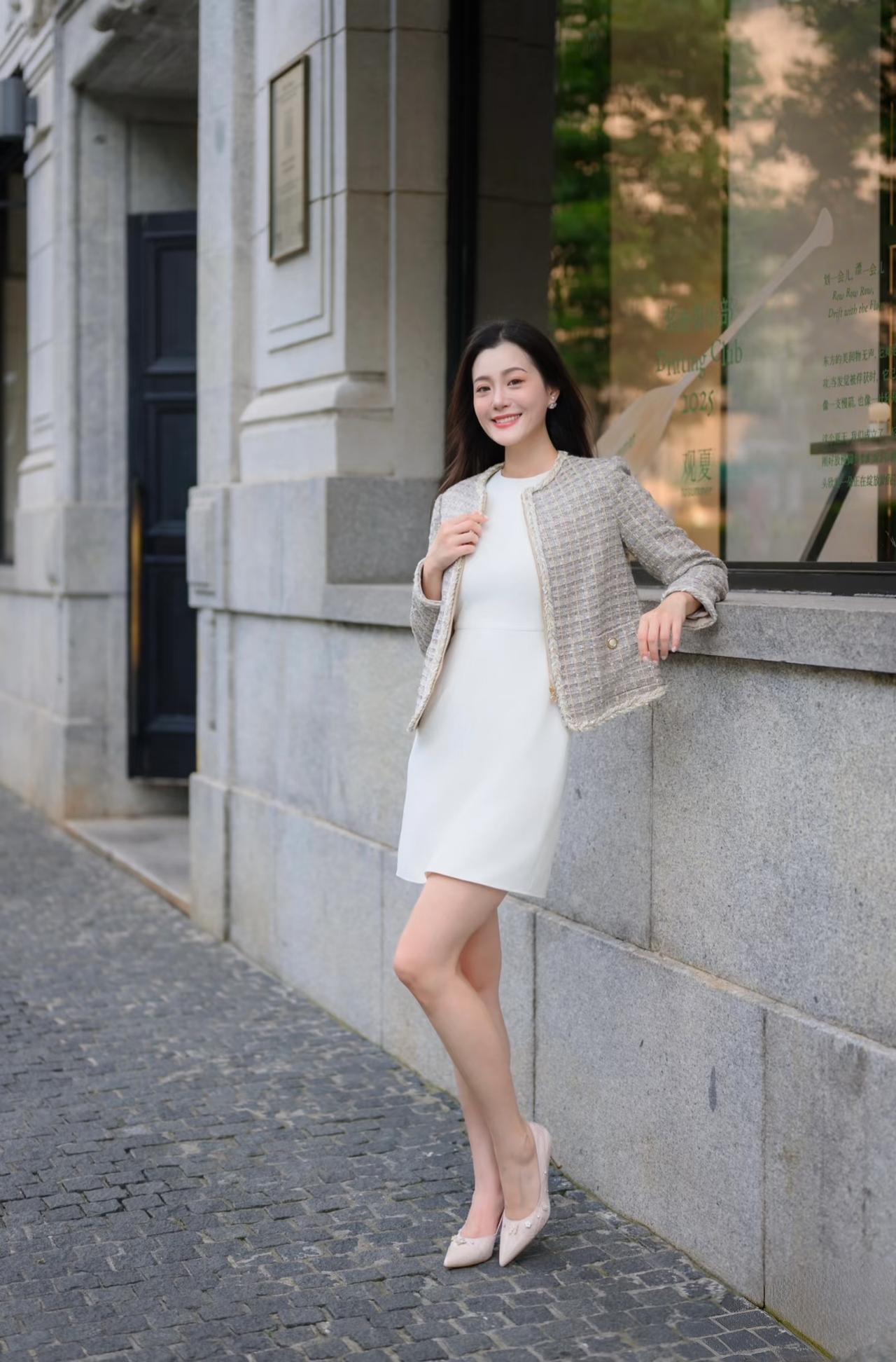 女生如何穿搭看起来时尚更有品味呢一件短款外套,一条白色无袖连衣裙,就可以展现女性