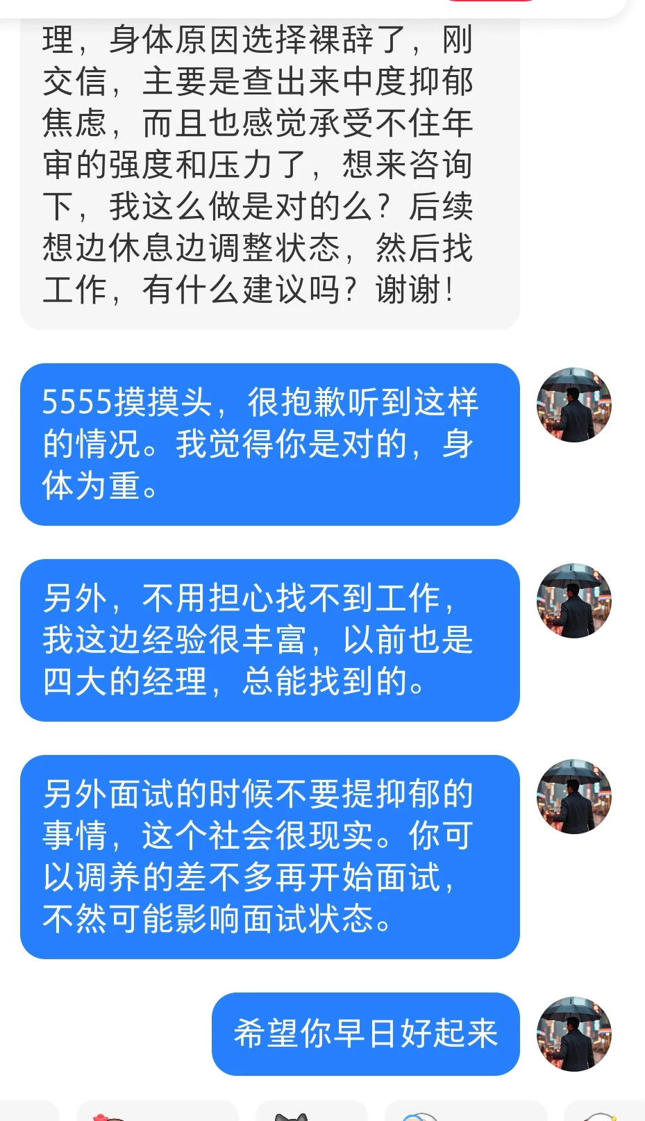 投稿:hello~我是四大刚升的审计经理,身体原因选择裸辞了,刚交信,主要是查出来中度抑郁焦虑,而且也感觉承受不住年审的强度和压力了,想来咨询下,我这么做是对的么?后续想边休息边调整状态,然后找工作,有什么建议吗?谢谢!