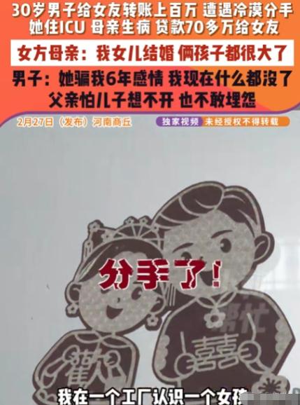 2月27日,河南商丘,一小伙打工时与一女子相恋,交往六年,女子以母亲生病、自己眼睛手术、欠高利贷等理由,陆续索要上百万元,小伙还给了3.6万彩礼。本以为能结婚,女子却突然提分手。小伙追到女方家,竟得知女子早已结婚还有俩孩子。小伙父亲六十多岁还在打工,攒的钱全给了儿子,这下人财两空还欠债,心疼得直哭。网友:农村大龄青年因着急成家,常被骗子拿捏。 小伙的父亲已经六十多岁,仍在工地打工,一辈子攒下的积蓄全都给了儿子谈恋爱,如今儿子不仅人财两空,还背上了七十多万元的债务,老人心疼得直掉眼泪,却又怕儿子想不开,连一句重话都不敢说。 事情的经过要从六年前说起,小伙在工厂流水线上打工,每天重复着枯燥的工作,收入也不高。他和这名女子在工厂相识后,对方表现得温柔体贴,很快就俘获了他的真心。 小伙性格老实本分,对待感情十分认真,认定对方就是自己要共度一生的人。女子抓住了他的这个特点,开始以各种借口向他要钱。 一开始,女子说自己母亲得了重病需要手术费,小伙毫不犹豫地拿出了自己的积蓄。 后来,女子又说自己眼睛出了问题,需要做昂贵的手术,小伙四处向亲戚朋友借钱,甚至去银行贷款,把钱源源不断地转给对方。 再后来,女子又声称自己欠了高利贷,被人追债,小伙担心她出事,又想方设法凑钱帮她还债。 六年时间里,小伙前前后后转给女子的钱超过了一百万元,其中还包括 3.6 万元的彩礼。他省吃俭用,把所有的钱都花在了女子身上,甚至不惜让自己的家庭背负沉重的债务。 他的父亲六十多岁了,为了帮他减轻负担,还在工地上干着重体力活,把攒了一辈子的养老钱都拿了出来。 就在小伙满心期待婚礼的时候,女子却突然提出了分手,并且态度十分冷漠,之后就彻底失联了。小伙无法接受这个现实,四处打听女子的下落,最终找到了她的老家。 可当他找上门去,才得知一个让他如遭雷击的真相:女子早已结婚,并且还有两个孩子,所谓的恋爱,从一开始就是一场骗局。 小伙得知真相后,整个人都崩溃了。他不仅失去了六年的感情,还背负了七十多万元的债务,家里的积蓄也被掏空。他的父亲看着儿子失魂落魄的样子,心疼得直哭,却又不敢过多埋怨,怕儿子一时想不开做出傻事。 这件事在网上曝光后,引发了网友的广泛关注和热议。 有网友评论说,农村大龄青年因为着急成家,很容易被骗子抓住心理弱点,一步步陷入对方设计好的陷阱。 还有网友表示,现在婚恋市场上的骗局越来越多,大家一定要提高警惕,不要轻易相信陌生人,更不要在没有核实对方身份的情况下,随意给对方转账。 也有网友感慨,像小伙这样的老实人,在感情里总是容易受伤,他们付出了真心和全部的积蓄,却换来一场空。 还有人呼吁,相关部门应该加强对婚恋骗局的打击力度,同时也要加强对农村大龄青年的婚恋教育,提高他们的防范意识。 这件事给大家敲响了警钟,在婚恋交往中,一定要保持清醒的头脑,不要被爱情冲昏头脑。 涉及到金钱往来时,一定要谨慎,不要轻易相信对方的各种借口,更不要在没有核实对方身份和真实情况的情况下,随意转账。尤其是农村大龄青年,在面对婚恋问题时,不要因为着急成家而失去判断力,要多留一个心眼,避免陷入骗局。 在这个事件中,我们还能看到更深层的社会问题。农村地区的婚恋压力,让很多大龄青年在择偶时变得焦虑,这种焦虑很容易被别有用心的人利用。 一些骗子正是看准了这一点,专门针对农村大龄青年实施婚恋诈骗,他们用虚假的身份和情感承诺,一步步骗取对方的信任和钱财,等到对方发现时,往往已经人财两空,甚至背负巨额债务。 对于这些受害者来说,不仅经济上遭受了巨大损失,心理上也留下了难以愈合的创伤。他们可能会对感情失去信心,对社会产生不信任感,甚至影响到未来的生活和发展。而对于整个社会来说,婚恋骗局的频发,也破坏了社会的信任基础,加剧了人们对婚恋问题的焦虑和不安。 要解决这个问题,需要多方面的努力。一方面,相关部门要加大对婚恋骗局的打击力度,依法严惩骗子,让他们付出应有的代价。另一方面,也要加强对农村大龄青年的婚恋教育和心理疏导,帮助他们树立正确的婚恋观,提高他们的防范意识和辨别能力。 同时,社会各界也应该关注农村大龄青年的婚恋问题,为他们提供更多的交友渠道和婚恋服务,减少他们的婚恋压力,让他们能够更加理性地对待感情和婚姻。 大家对这件事有什么看法?欢迎在评论区留言讨论。