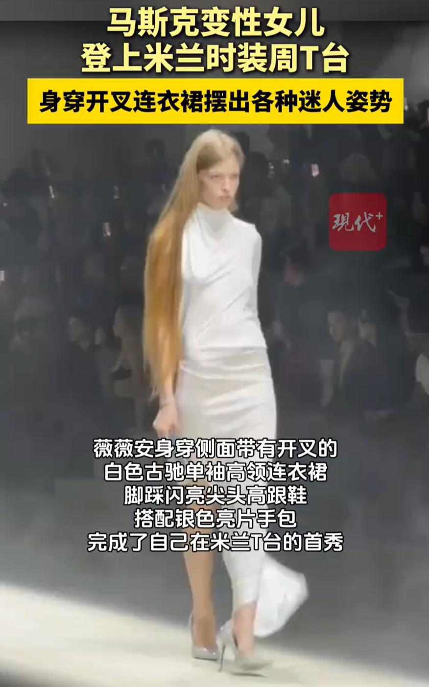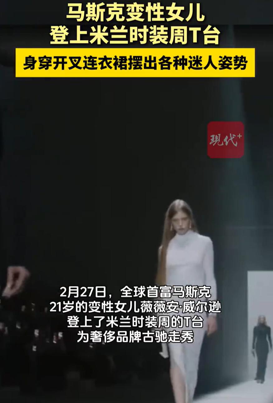 这下马斯克的脸都要黑了!马斯克的变形女儿最近干了件大事,就是登上米兰时装周T台,而在走T台时,各种妖娆妩媚的姿势也是登上头条。网友:原来可以是上桌的,现在变成餐桌上的了 2月27号,米兰时装周,古驰的大秀。聚光灯下,一个高挑的身影走出来:一头金色长直发,白色单袖高领连衣裙,裙摆侧面开着叉,脚上踩着闪瞎眼的尖头细高跟。台步走得嘛,怎么说呢,挺有“个人特色”的,姿势摆得也足够妖娆妩媚 没错,这位就是马斯克那位宣称早就断绝关系、连姓都改成妈姓的女儿,薇薇安·威尔逊。 而网友们的话说的也没错,意思到位了。曾经的泽维尔·马斯克,正儿八经的富家少爷,要是按部就班,以后是继承家业的。现在呢?薇薇安站在T台上,让全世界围观。这身份转换,确实有点大 而且从表面来看,她就是在T台走了一圈,但如果细想,就没那么简单了 时尚圈那些人精,哪个不是人精中的人精?薇薇安的衣服是古驰新总监德姆纳亲自设计衣服,让她压轴亮相,图啥?肯定不是光看中她台步有多专业 图的就是那个标签:马斯克那个公开决裂的跨性别女儿 这标签往台上一站,流量自然就来。时尚圈的人不用明说,但大家都懂,这就是一种态度。硅谷大佬不是看不上时装周吗?觉得不就是几块布料折腾来折腾去?那行,你家孩子来给我们走秀,而且走得还挺高调 你说这事跟马斯克没关系吧,处处都是他。你说有关系吧,他还真管不着