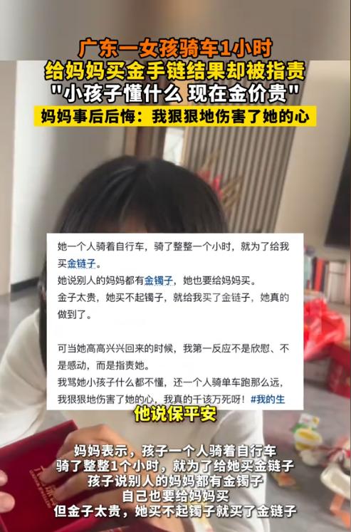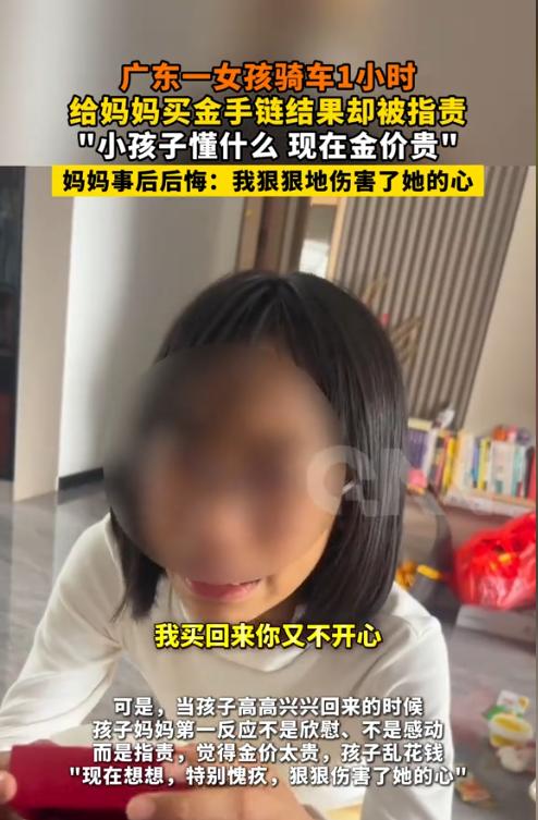 广东,一小姑娘为了给妈妈一个惊喜,拿着攒了好久的零花钱,骑车一个多小时,给妈妈买了条黄金手链,她还不忘带上妈妈最爱吃的泡鸭掌。可当小姑娘将礼物交给妈妈时,没有得到应有的表扬和拥抱,妈妈的一句:“金价这么贵还乱花钱”,让小姑娘当场崩溃大哭。 据悉,此事发生在2月25日,这个才13岁的小姑娘拿出了自己的存钱罐,将以前存的零花钱以及今年刚拿到的压岁钱都放在一起,数了数大概有千元。这次她做了一个重要的决定,就是给妈妈买条黄金手镯。 原来,小姑娘每次放学时,会看到同学的妈妈们有戴金手镯或金项链的,甚是好看,而自己的妈妈却连个金镯子、金项链都没有,所以就产生了给妈妈买个黄金首饰的想法。 由于金店距离家里比较远,小姑娘独自一人骑自行车骑了1个多小时才找到一家大型连锁金店。 可是进入金店后,小姑娘发现现在的金价已经涨上了天,她手中的钱根本买不起金手镯。 但是自己来都来了,既然买不起金手镯,那就换一个便宜点的,于是在店员的推荐下,小姑娘选了一个金手链。 店员得知小姑娘是给自己的妈妈买金手链后,那是羡慕极了,一直在感叹自己家怎么不出个这么贴心的小棉袄。 在离开金店后,小姑娘又骑车来到一家熟食店门口,她给妈妈买了最爱吃的泡鸭掌。 之后,小姑娘又骑了1个多小时,满头大汗的回到了家,但心里却十分开心,以及带有一点小小的期待,想看看妈妈收到礼物时笑开花的样子。 然而当小姑娘把首饰盒以及泡鸭掌交给妈妈时,却没有得到该有的表扬和拥抱,反而得到了妈妈的一顿数落:“你不知道现在金价多贵吗?还这么乱花钱!” 那一刻,小姑娘的心都要碎了,她低下了头,眼泪忍不住地流了下来。随后,小姑娘突然对着妈妈大吼了一句:“别人的妈妈都有金镯子,金镯子我买不起,我给你买条金链子,我买回来你又不开心了!” 那一字一句的控诉,像重锤一样砸在妈妈的心头。 事后,小姑娘的妈妈也表达了后悔之情,她认为自己不该这么说孩子。 可是她的行为,已经对小姑娘的心灵造成了创伤。 有不少网友表示,现在很多父母真的不会说话,小孩子要的就是父母的一点点鼓励,可有些父母就习惯性的说些冷嘲热讽的话,这对小孩子来说,伤害是很大的。 还有网友表示,现在的金价的确是贵,但孩子懂什么,她只想把自己的全部都献给妈妈,妈妈怎么能用金钱来衡量孩子的感情呢?真不配为人母。 甚至有网友讲述了自己的经历,他说自己小的时候给爸爸画了幅画,谁知爸爸说浪费颜料。现在自己已经30多岁了,再也没给爸爸买过任何礼物。有些伤害,是一辈子的。 确实,就本次事件来说,妈妈的这番话,的确太伤孩子的心了。 这看似是一条金链子,可这是女儿对妈妈的全部的爱,然而妈妈却将典型的“中式含蓄病”给当场发作了。 其实现在很多父母习惯了用“打击式教育”来表达关心,明明心里感动得要死,嘴上却非要挑刺。 他们以为这是“为你好”,教你勤俭节约,但在孩子眼里,这就是“我不配”。 父母否定的不是礼物,而是孩子那颗爱你的心。如果长此以往,孩子也会不懂得感恩。 真正的富养,不是给多少钱,而是给足了孩子“配得感”——让他知道,我的爱很贵,我也很贵。 《家庭教育促进法》第14条规定,父母或者其他监护人应当树立家庭是第一个课堂、家长是第一任老师的责任意识,承担对未成年人实施家庭教育的主体责任,用正确思想、方法和行为教育未成年人养成良好思想、品行和习惯。 如果父母都像小姑娘的妈妈一样,只会用打压式教育来对待孩子,那将来就等着孩子的反击吧,毕竟这是父母教给孩子的行为习惯。 最后,教育孩子一定不能操之过急,一定要潜移默化、严慈相济、尊重差异、平等交流、相互促进,这几点缺一不可。希望当家长的好好学习下如何接纳孩子的爱,不要像小姑娘的妈妈那样,只会泼冷水。 对此,您怎么看?欢迎留言交流。