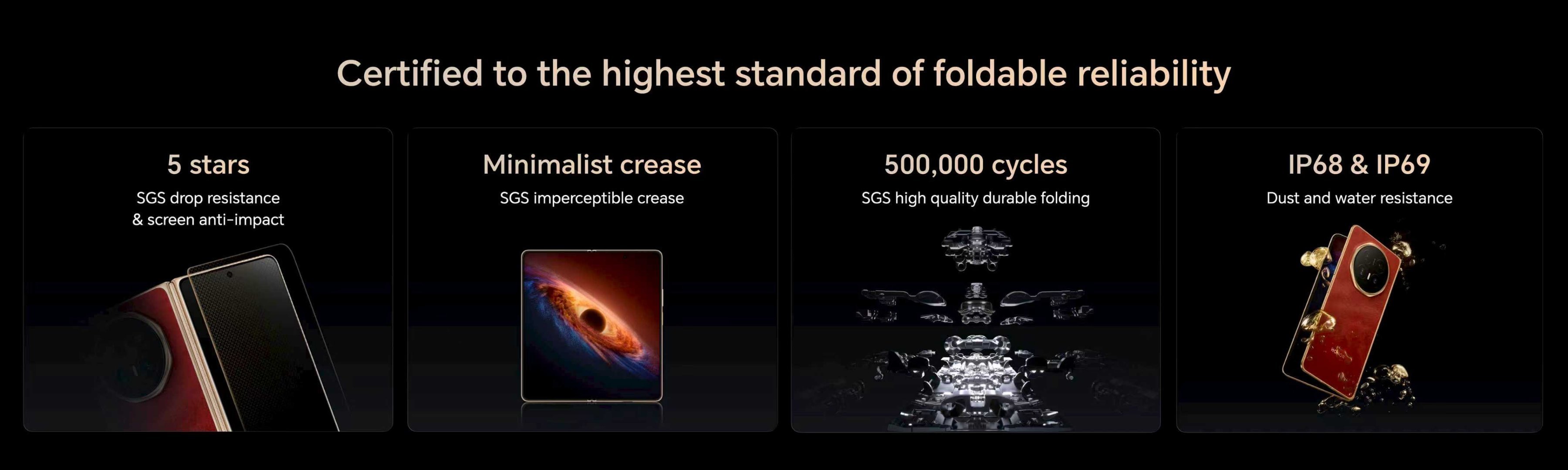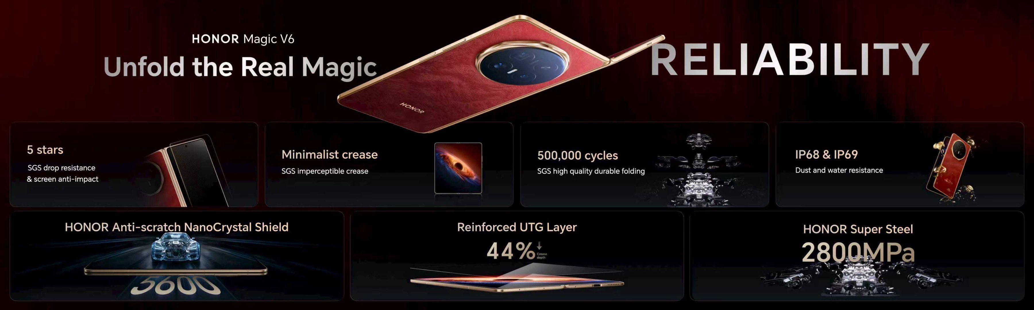 耐用性方面,荣耀 Magic V6 通过 SGS 五星抗摔认证,支持 IP68/IP69 双级防尘防水,可抵御高压热水喷射;通过 SGS 认证支持 50 万次开合无故障,远超行业标准。