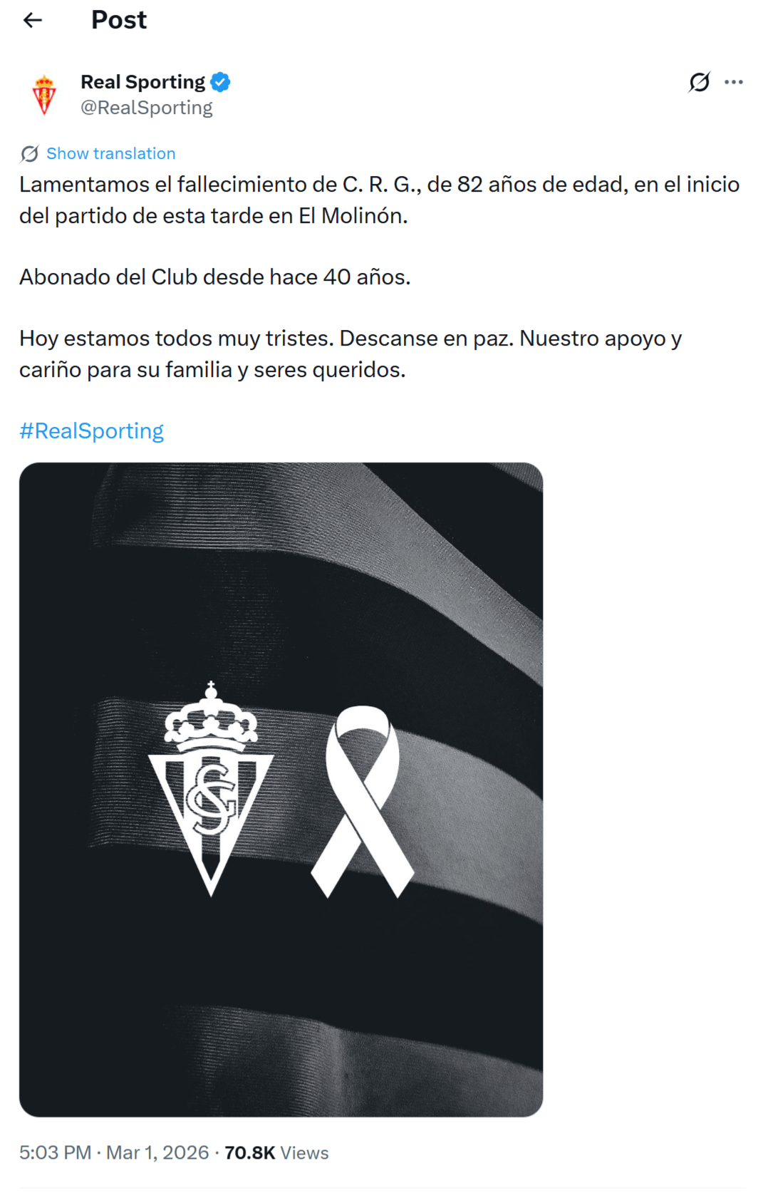 希洪竞技通过官方X账号发布声明称,去世者为一名82岁的男性球迷,自40年前起便是俱乐部的季票持有者。“今天我们都十分悲痛。愿他安息。向他的家人和亲友致以支持与关怀。”俱乐部写道。