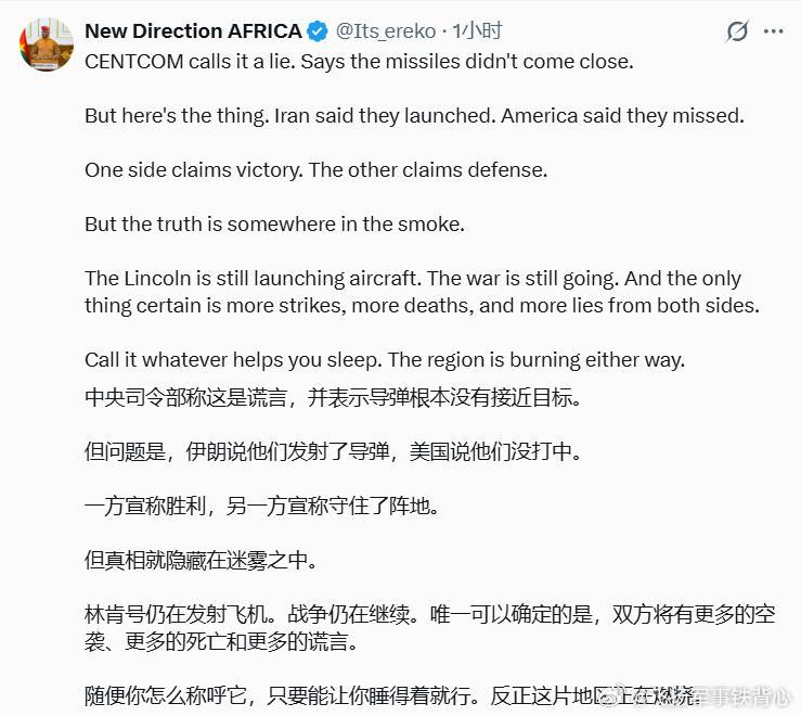 伊朗说发射了导弹打林肯号。美军中央司令部说林肯号航母未被击中。两边都赢麻了。烽火