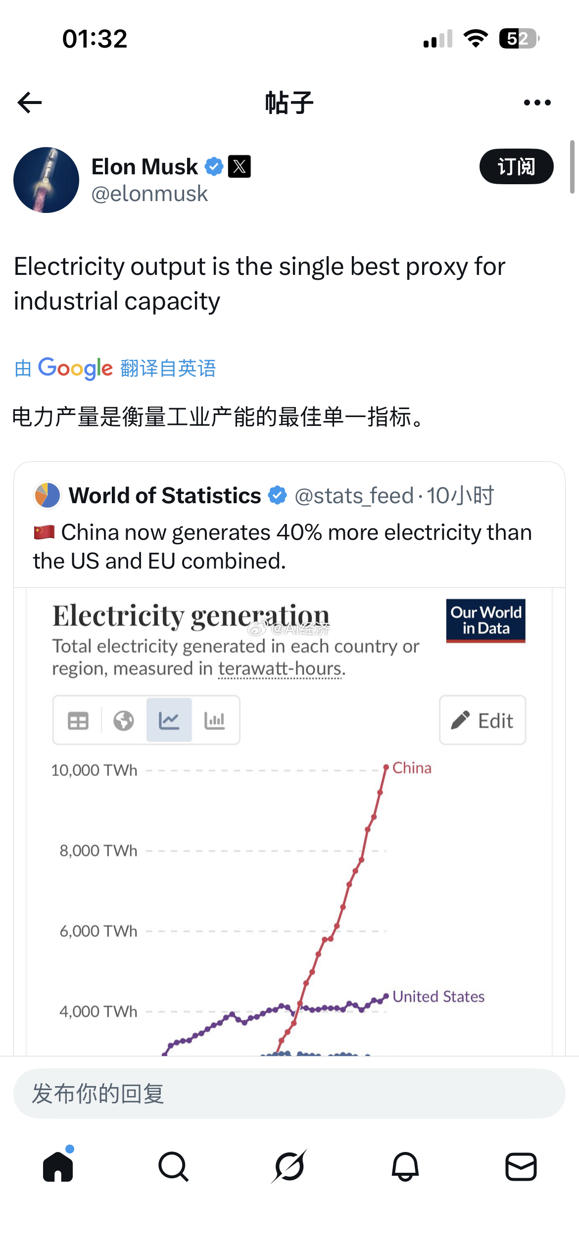 🇨🇳中国目前的发电量比美国和欧盟的总和还要多 40%。马斯克:电力产量是衡量工业产能的最佳单一指标。